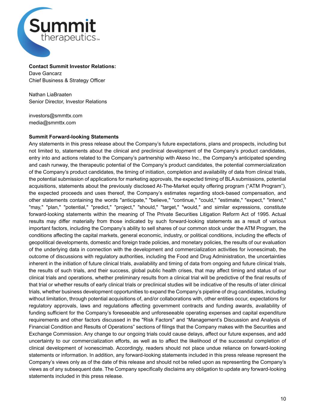 10联系峰会投资者关系:Dave Gancarz首席业务和战略官Nathan LiaBraaten投资者关系高级总监Investors@smmttx.com media@smmttx.com峰会前瞻性声明本新闻稿中有关公司未来预期、计划和前景的任何声明,包括但不限于有关公司候选产品的临床和临床前开发、与公司与Akeso Inc.的合作关系相关的进入和行动的声明、公司预期的支出和现金跑道、公司候选产品的治疗潜力、公司候选产品的潜在商业化、启动时间,临床试验数据的完成和可用性、可能提交的上市批准申请、BLA提交的预期时间、潜在的收购、关于先前披露的市场股票发行计划(“ATM计划”)的陈述、预期收益及其用途、公司关于基于股票的薪酬的估计,以及包含“预期”、“相信”、“继续”、“可能”、“估计”、“预期”、“打算”、“可能”、“计划”、“潜在”、“预测”、“项目”、“应该”、“目标”、“将”和类似表述,构成1995年《私人证券诉讼改革法案》含义内的前瞻性陈述。由于各种重要因素,包括公司根据ATM计划出售我们普通股的能力、影响资本市场的条件、一般经济、行业或政治条件,包括地缘政治发展、国内外贸易政策和货币政策的影响、我们对与ivonescimab的开发和商业化活动相关的基础数据的评估结果、与包括食品和药物管理局在内的监管机构的讨论结果,实际结果可能与此类前瞻性陈述所表明的结果存在重大差异,可能影响我们临床试验和运营的时间和状态的未来临床试验的启动、正在进行和未来临床试验的数据的可用性和时间、此类试验的结果及其成功、全球公共卫生危机、临床试验的初步结果是否将预测该试验的最终结果或早期临床试验或临床前研究的结果是否将指示后期临床试验的结果,是否扩大公司候选药物管道的业务发展机会,包括但不限于,通过对其他实体的潜在收购和/或合作发生、对监管批准的预期、影响政府合同和资金奖励的法律法规、足以满足公司可预见和不可预见的运营费用和资本支出要求的资金可用性以及公司向美国证券交易委员会提交的文件的“风险因素”和“管理层对财务状况和运营结果的讨论和分析”部分中讨论的其他因素。我们正在进行的试验的任何变化都可能导致延误,影响我们未来的开支,并为我们的商业化努力增加不确定性,以及影响成功完成ivonescimab临床开发的可能性。因此,读者不应过分依赖前瞻性陈述或信息。此外,本新闻稿中包含的任何前瞻性陈述仅代表公司截至本新闻稿发布之日的观点,不应被视为代表公司截至任何后续日期的观点。该公司明确表示不承担更新本新闻稿中包含的任何前瞻性陈述的任何义务。