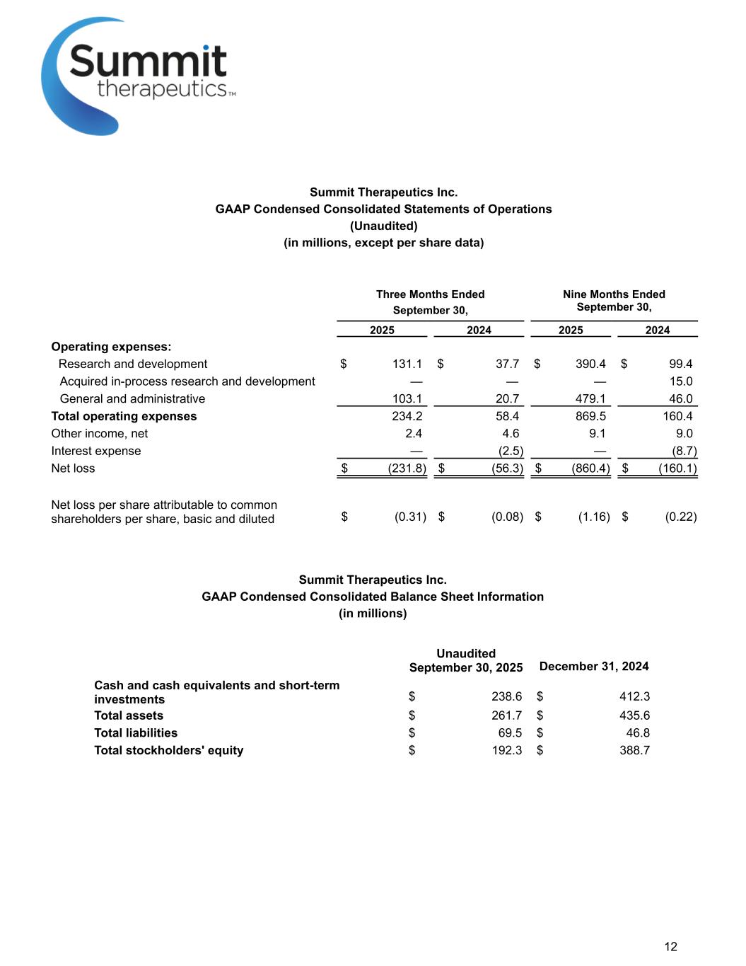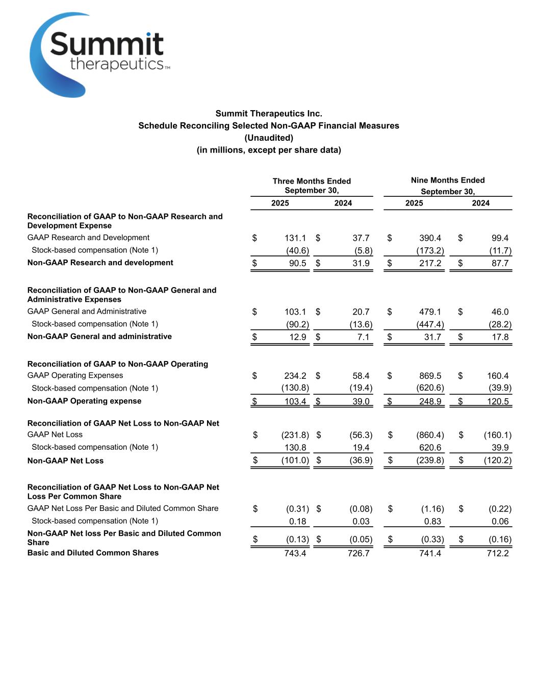 Summit Therapeutics Inc.附表核对选定的非GAAP财务指标(未经审计)(以百万计,每股数据除外)截至9月30日止三个月,截至9月30日止九个月,2025202420252024 GAAP与非GAAP研发费用的对账GAAP研发131.1美元37.7美元390.4美元99.4美元股票薪酬(注1)(40.6)(5.8)(173.2)(11.7)非GAAP研发90.5美元31.9美元217.2美元87.7美元GAAP与非GAAP一般和行政费用的对账GAAP一般和行政103.1美元20.7美元479.1美元46.0美元股票薪酬(注1)(90.2)(13.6)(447.4)(28.2)非GAAP一般和行政$ 12.9 $ 7.1 $ 31.7 $ 17.8 GAAP与Non-GAAP运营GAAP运营费用的对账$ 234.2 $ 58.4 $ 869.5 $ 160.4基于股票的薪酬(注1)(130.8)(19.4)(620.6)(39.9)Non-GAAP运营费用$ 103.4 $ 39.0 $ 248.9 $ 120.5 GAAP净亏损与Non-GAAP净亏损的对账$(231.8)$(56.3)$(860.4)$(160.1)基于股票的薪酬(注1)130.8 19.46 20.639.9 Non-GAAP净亏损$(101.0)$(36.9)$(239.8)$(120.2)GAAP净亏损与Non-GAAP净亏损的对账每股普通股GAAP净亏损基本和稀释普通股$(0.31)$(0.08)$(1.16)$(0.22)基于股票的薪酬(注1)0.18 0.03 0.83 0.06非公认会计准则每股基本和稀释普通股净亏损$(0.13)$(0.05)$(0.33)$(0.16)基本和稀释普通股743.47 26.77 41.47 12.2