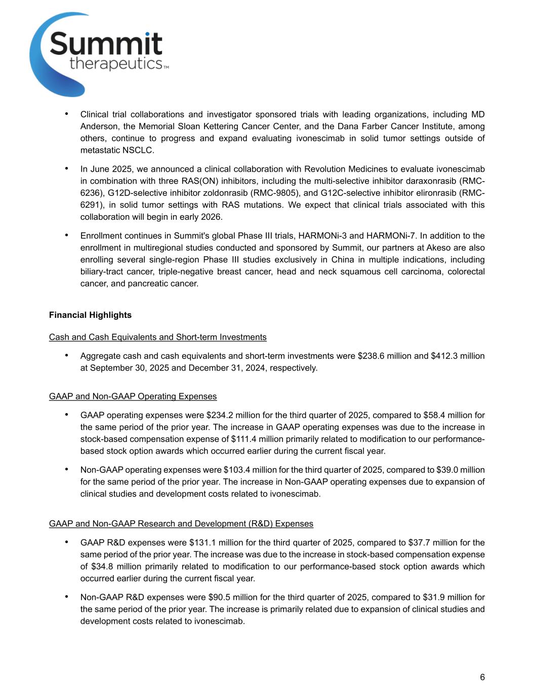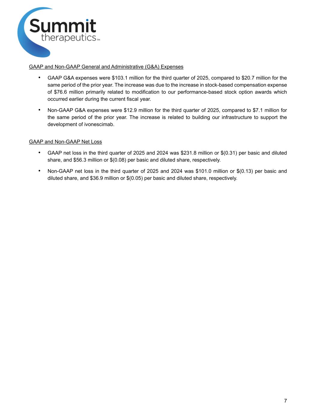 6•临床试验合作和研究者赞助的试验与领先组织,包括MD安德森、纪念斯隆凯特琳癌症中心和达纳法伯癌症研究所等,继续取得进展并扩大评估ivonescimab在转移性NSCLC之外的实体瘤环境中的应用。• 2025年6月,我们宣布与Revolution Medicines进行临床合作,评估ivonescimab联合三种RAS(ON)抑制剂,包括多选择性抑制剂daraxonrasib(RMC-6236)、G12D选择性抑制剂zoldonrasib(RMC-9805)和G12C选择性抑制剂elironrasib(RMC-6291),在具有RAS突变的实体瘤环境中的疗效。我们预计,与这一合作相关的临床试验将于2026年初开始。• Summit的全球III期试验、HARMONI-3和HARMONI-7继续招生。除了Summit开展和赞助的多区域研究的入组,我们在Akeso的合作伙伴还在多个适应症中在中国独家入组多个单区域III期研究,包括胆道癌、三阴性乳腺癌、头颈部鳞状细胞癌、结直肠癌和胰腺癌。财务摘要现金和现金等价物及短期投资•截至2025年9月30日和2024年12月31日,现金和现金等价物及短期投资总额分别为2.386亿美元和4.123亿美元。GAAP和非GAAP运营费用• 2025年第三季度GAAP运营费用为2.342亿美元,上年同期为5840万美元。GAAP运营费用的增加是由于基于股票的薪酬费用增加了1.114亿美元,这主要与我们在本财年早些时候发生的基于业绩的股票期权奖励的修改有关。• 2025年第三季度非美国通用会计准则运营费用为1.034亿美元,上年同期为3900万美元。由于扩大与ivonescimab相关的临床研究和开发成本,导致Non-GAAP运营费用增加。GAAP和Non-GAAP研发(研发)费用• 2025年第三季度GAAP研发费用为1.311亿美元,上年同期为3770万美元。这一增长是由于基于股票的薪酬支出增加了3480万美元,这主要与本财年早些时候发生的对我们基于业绩的股票期权奖励的修改有关。• 2025年第三季度非美国通用会计准则研发费用为9050万美元,上年同期为3190万美元。这一增长主要是由于扩大了与ivonescimab相关的临床研究和开发成本。