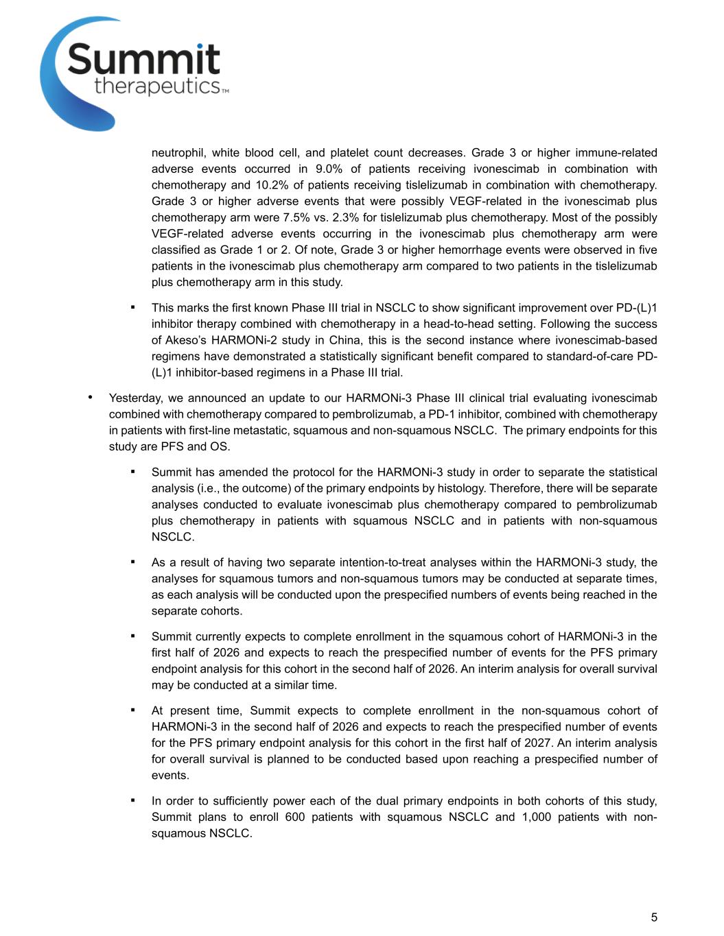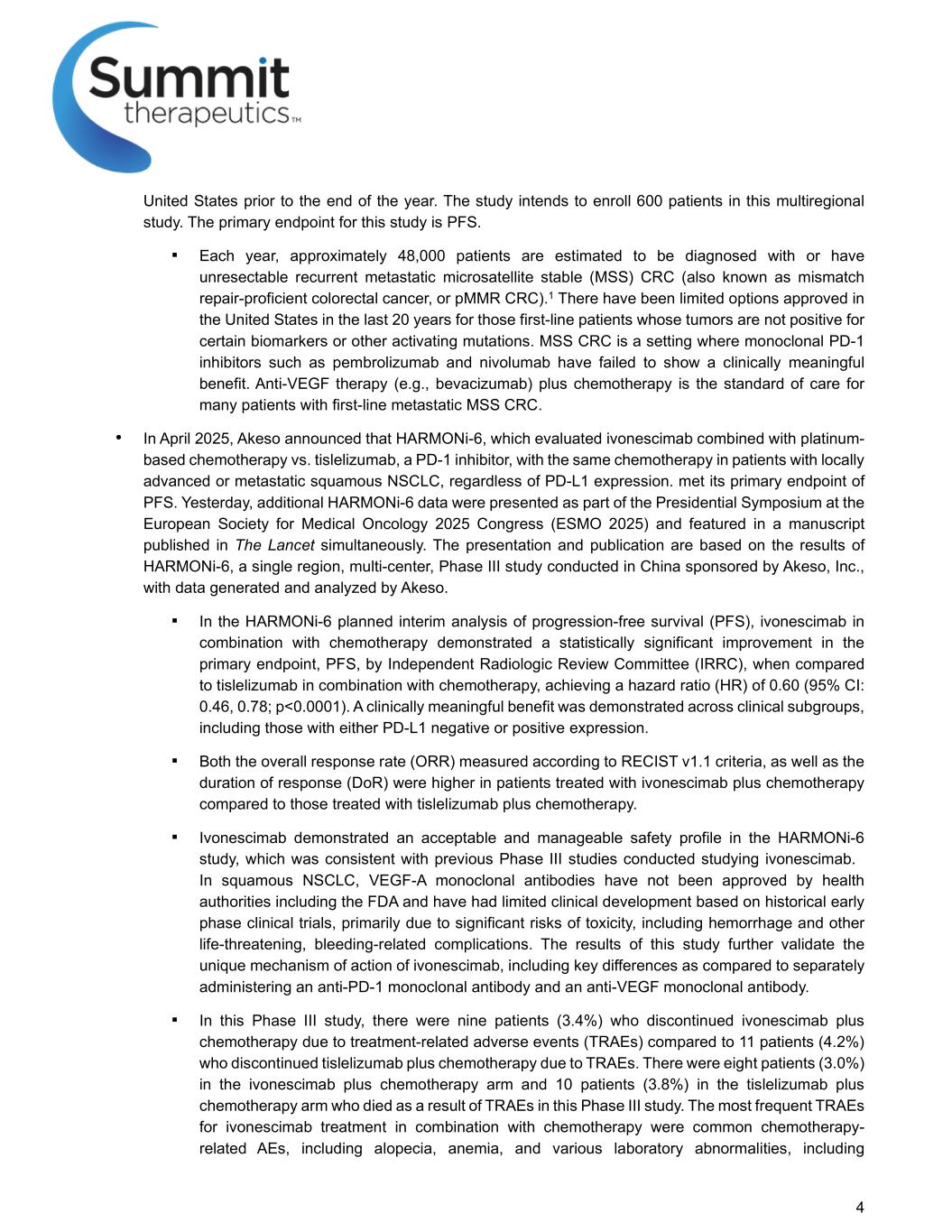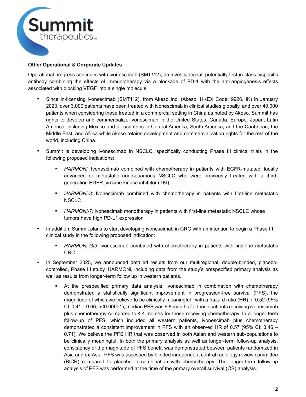 2其他运营和企业更新运营进展继续推进ivonescimab(SMT112),这是一种研究性、潜在一流的双特异性抗体,将通过阻断PD-1的免疫疗法的效果与与阻断VEGF进入单分子相关的抗血管生成作用相结合:•自2023年1月Akeso Inc.(Akeso,HKEX代码:9926.HK)获得ivonescimab(SMT112)的许可以来,全球已有超过3,000名患者在临床研究中接受了ivonescimab治疗,如Akeso所述,在考虑在中国商业环境中接受治疗的患者时,已有超过40,000名患者。Summit拥有ivonescimab在美国、加拿大、欧洲、日本、拉丁美洲、包括墨西哥以及中美洲、南美洲、加勒比、中东和非洲所有国家的开发和商业化权利,而Akeso保留对包括中国在内的世界其他地区的开发和商业化权利。• Summit正在开发用于NSCLC的ivonescimab,具体在以下拟议适应症中开展III期临床试验:▪哈莫尼:伊沃奈西单抗联合化疗用于既往接受过第三代EGFR酪氨酸激酶抑制剂(TKI)治疗的EGFR突变、局部晚期或转移性非鳞状NSCLC患者▪Harmoni-3:伊沃奈西单抗联合化疗治疗一线转移性NSCLC患者▪Harmoni-7:ivonescimab单药治疗肿瘤PD-L1高表达的一线转移性NSCLC患者•此外,Summit计划开始在CRC中开发ivonescimab,并打算开始以下拟议适应症的III期临床研究:▪Harmoni-GI3:ivonescimab联合化疗治疗一线转移性CRC患者• 2025年9月,我们公布了我们的多区域、双盲、安慰剂对照、III期研究Harmoni的详细结果,包括该研究预先指定的主要分析数据以及西方患者长期随访的结果。在预先指定的主要数据分析中,ivonescimab联合化疗在无进展生存期(PFS)方面有统计学意义的改善,我们认为其幅度具有临床意义,风险比(HR)为0.52(95% CI:0.41 – 0.66;p < 0.00001);接受ivonescimab联合化疗的患者的中位PFS为6.8个月,而接受化疗的患者为4.4个月。在一项包括所有西方患者的更长期的PFS随访中,ivonescimab加化疗在PFS方面表现出持续的改善,观察到的HR为0.57(95% CI:0.46 – 0.71)。我们认为在亚洲和西方亚人群中均观察到的PFS HR具有临床意义。在主要分析和较长期随访分析中,在亚洲和亚洲以外地区随机分配的患者之间证明了PFS获益幅度的一致性。与安慰剂联合化疗相比,采用盲法独立中心放射学审查委员会(BICR)评估PFS。在初次总生存期(OS)分析时进行较长期的PFS随访分析。