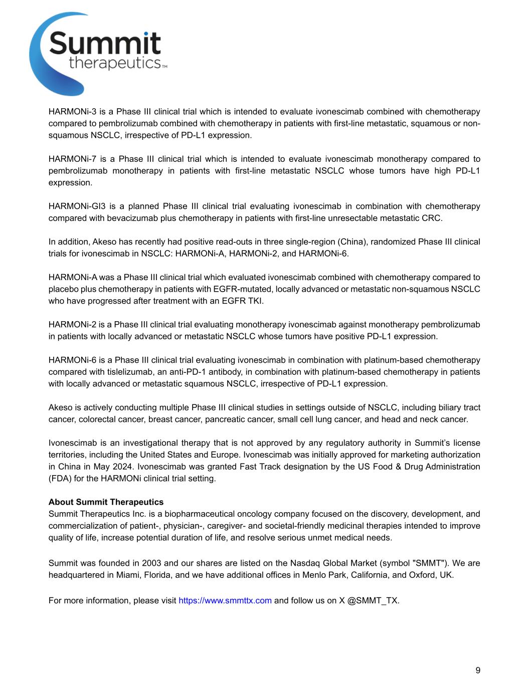 9 HARMONI-3是一项III期临床试验,旨在评估ivonescimab联合化疗与pembrolizumab联合化疗在一线转移性、鳞状或非鳞状NSCLC患者中的疗效,无论PD-L1表达如何。HARMONi-7是一项III期临床试验,旨在评估肿瘤PD-L1高表达的一线转移性NSCLC患者中ivonescimab单药治疗与pembrolizumab单药治疗的对比。HARMONi-GI3是一项计划中的III期临床试验,评估ivonescimab联合化疗与贝伐珠单抗联合化疗在一线不可切除转移性CRC患者中的比较。此外,Akeso近期在3个单区(中国)、iVonescimab治疗NSCLC的随机III期临床试验中均有阳性读数:HARMONI-A、HARMONI-2、HARMONI-6。HARMONi-A是一项III期临床试验,在EGFR TKI治疗后进展的EGFR突变、局部晚期或转移性非鳞状NSCLC患者中评估ivonescimab联合化疗与安慰剂联合化疗的比较。HARMONI-2是一项III期临床试验,在肿瘤PD-L1表达阳性的局部晚期或转移性NSCLC患者中评估单一疗法ivonescimab对抗单一疗法pembrolizumab。Harmoni-6是一项III期临床试验,评估ivonescimab联合铂类化疗与抗PD-1抗体替雷利珠单抗联合铂类化疗在局部晚期或转移性鳞状NSCLC患者中的疗效,无论PD-L1表达如何。Akeso正在NSCLC以外的环境中积极开展多项III期临床研究,包括胆道癌、结直肠癌、乳腺癌、胰腺癌、小细胞肺癌、头颈癌。Ivonescimab是一种研究性疗法,未获得Summit许可地区任何监管机构的批准,包括美国和欧洲。伊沃奈西单抗最初于2024年5月在中国获批上市许可。Ivonescimab被美国食品药品监督管理局(FDA)授予HarMONI临床试验设置的快速通道指定。关于Summit TherapeuticsSummit Therapeutics公司是一家生物制药肿瘤学公司,专注于发现、开发和商业化对患者、医生、护理人员和社会友好的药物疗法,旨在提高生活质量、增加潜在的生命持续时间并解决严重的未满足的医疗需求。Summit成立于2003年,我们的股票在纳斯达克全球市场上市(代码“SMMT”)。我们的总部设在佛罗里达州迈阿密,并在加利福尼亚州门洛帕克和英国牛津增设了办事处。更多资讯,请登陆https://www.smmttx.com,关注我们X @SMMT _ TX。