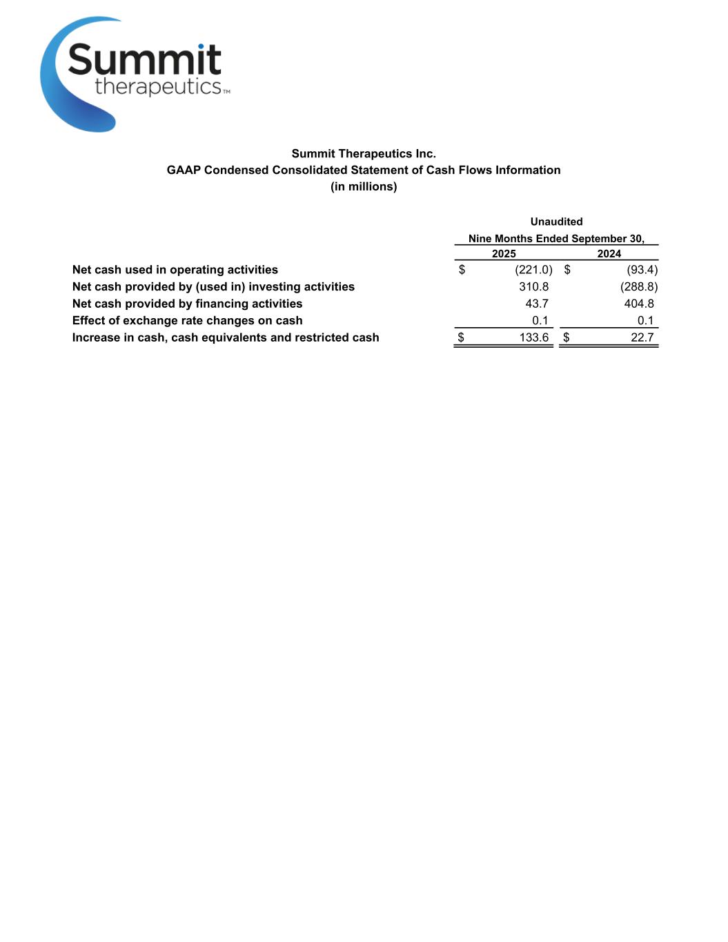 Summit Therapeutics Inc. GAAP简明合并现金流量表信息(百万)截至2025年9月30日止九个月未经审计2024年经营活动使用的现金净额$(221.0)$(93.4)投资活动提供(用于)的现金净额310.8(288.8)筹资活动提供的现金净额43.74 04.8汇率变动对现金的影响0.10.1现金、现金等价物和受限制现金增加133.6美元22.7