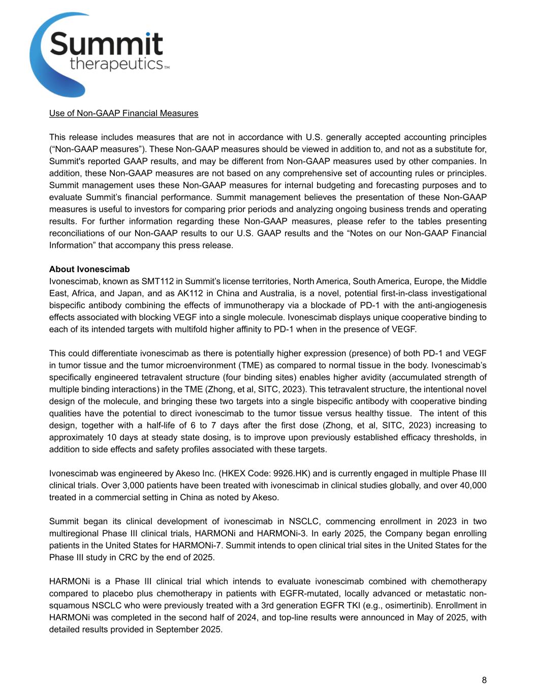 8非公认会计原则财务措施的使用本新闻稿包含不符合美国公认会计原则的措施(“非公认会计原则措施”)。这些非GAAP衡量标准应被视为Summit报告的GAAP结果的补充,而不是替代,并且可能与其他公司使用的非GAAP衡量标准不同。此外,这些非公认会计准则计量并非基于任何一套全面的会计规则或原则。Summit管理层将这些非GAAP措施用于内部预算和预测目的,并评估Summit的财务业绩。Summit管理层认为,这些非公认会计原则措施的介绍对投资者比较前期和分析持续的业务趋势和经营业绩很有用。有关这些非公认会计原则措施的更多信息,请参阅表格,这些表格显示了我们的非公认会计原则结果与我们的美国公认会计原则结果的对账,以及本新闻稿随附的“关于我们的非公认会计原则财务信息的说明”。关于ivonescimab ivonescimab,在Summit的许可地区、北美、南美、欧洲、中东、非洲和日本被称为SMT112,在中国和澳大利亚被称为AK112,是一种新型的、潜在的first-in-class在研双特异性抗体,将通过阻断PD-1的免疫疗法的效果与与将VEGF阻断成单一分子相关的抗血管生成作用相结合。当存在VEGF时,ivonescimab以对PD-1的多倍更高亲和力显示出与其每个预期靶点的独特合作结合。这可以区分ivonescimab,因为与体内正常组织相比,PD-1和VEGF在肿瘤组织和肿瘤微环境(TME)中的表达(存在)可能更高。ivonescimab的特异性工程四价结构(四个结合位点)可在TME中实现更高的亲和力(多重结合相互作用的积累强度)(Zhong,et al,SITC,2023)。这种四价结构,有意对分子进行新颖设计,并将这两个靶点带入具有协同结合品质的单一双特异性抗体中,有可能将ivonescimab导向肿瘤组织而不是健康组织。这种设计的目的,连同第一次给药后6至7天的半衰期(Zhong等人,SITC,2023年)在稳态给药时增加到大约10天,除了与这些靶点相关的副作用和安全性特征外,还旨在改善先前确定的疗效阈值。Ivonescimab由Akeso Inc.(港交所代码:9926.HK)设计,目前正在进行多个III期临床试验。Akeso指出,全球有超过3,000名患者在临床研究中接受了ivonescimab治疗,在中国有超过40,000名患者在商业环境中接受治疗。Summit开始其ivonescimab在NSCLC中的临床开发,于2023年开始在两项多区域III期临床试验中注册,即Harmoni和Harmoni-3。2025年初,该公司开始在美国为HARMONI-7招募患者。Summit打算在2025年底之前在美国开设临床试验场所,用于CRC的III期研究。Harmoni是一项III期临床试验,旨在评估ivonescimab联合化疗与安慰剂联合化疗在先前接受过第3代EGFR TKI(例如奥希替尼)治疗的EGFR突变、局部晚期或转移性非鳞状NSCLC患者中的比较。HARMONI的招生工作已于2024年下半年完成,顶线成绩已于2025年5月公布,详细成绩将于2025年9月提供。
