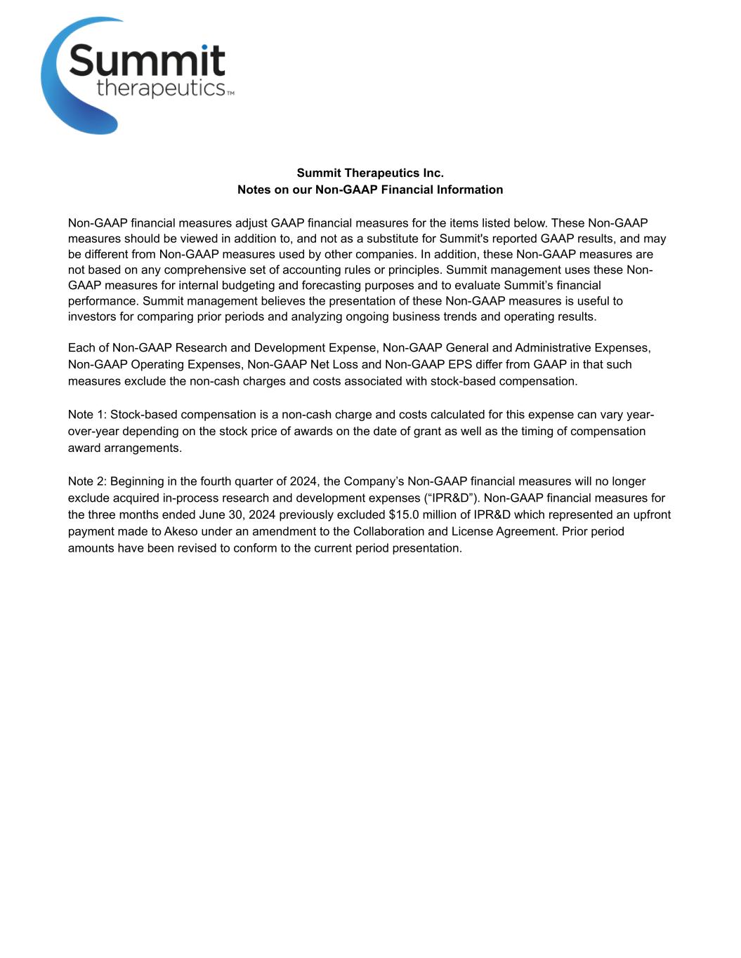Summit Therapeutics Inc.关于我们的非公认会计原则财务信息的说明非公认会计原则财务指标调整了以下所列项目的公认会计原则财务指标。这些非GAAP衡量标准应被视为Summit报告的GAAP结果的补充,而不是替代,并且可能与其他公司使用的非GAAP衡量标准不同。此外,这些非公认会计准则计量并非基于任何一套全面的会计规则或原则。Summit管理层将这些非GAAP衡量标准用于内部预算和预测目的,并评估Summit的财务业绩。Summit管理层认为,这些非公认会计原则措施的介绍对投资者比较前期和分析持续的业务趋势和经营业绩很有用。非美国通用会计准则的研发费用、非美国通用会计准则的一般和行政费用、非美国通用会计准则的运营费用、非美国通用会计准则的净亏损和非美国通用会计准则的每股收益都与美国通用会计准则不同,因为这些衡量标准不包括与股票薪酬相关的非现金费用和成本。注1:基于股票的薪酬是一项非现金费用,根据授予日奖励的股票价格以及补偿奖励安排的时间安排,为该费用计算的成本可能逐年变化。注2:从2024年第四季度开始,公司的非美国通用会计准则财务指标将不再排除收购的在研费用(“IPR & D”)。截至2024年6月30日止三个月的非公认会计准则财务指标此前不包括1500万美元的IPR & D,这是根据合作和许可协议修正案向Akeso支付的预付款。对前期金额进行了修订,以符合本期的列报方式。