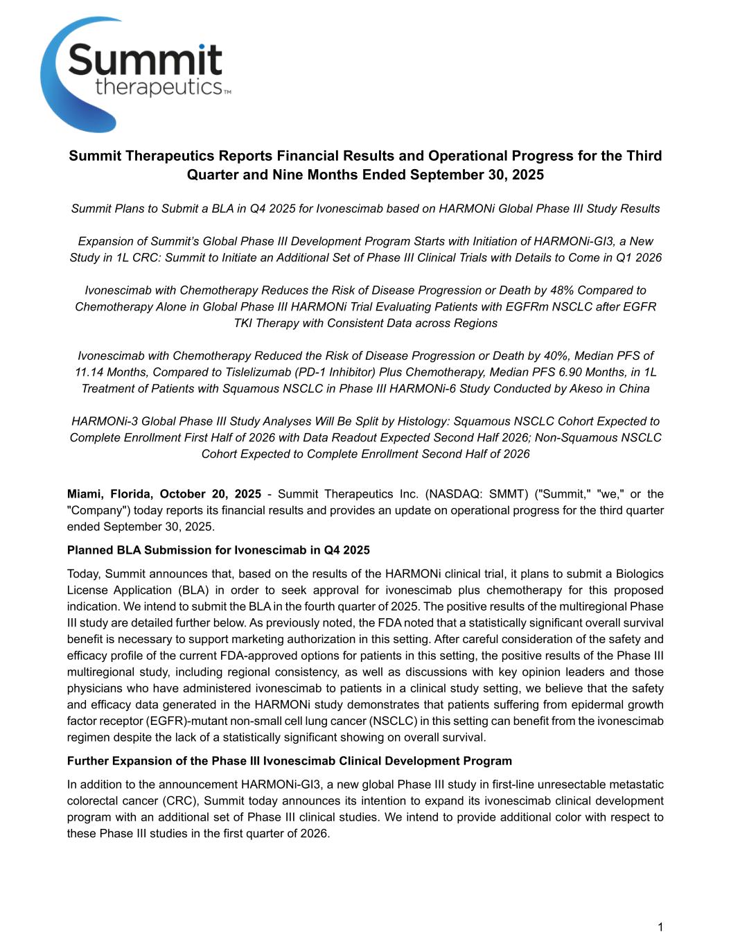 1 Summit Therapeutics报告截至2025年9月30日的第三季度和九个月的财务业绩和运营进展Summit计划根据Harmoni全球III期研究结果在2025年第四季度为ivonescimab提交BLA Summit的全球III期开发计划的扩展从启动Harmoni-GI3开始,1L CRC的一项新研究:Summit将启动一组额外的III期临床试验,详情将于2026年第一季度公布在全球III期Harmoni试验中,与单独化疗相比,联合化疗的ivonescimab可将疾病进展或死亡的风险降低48%,该试验评估EGFR TKI治疗后EGFRm NSCLC患者,跨区域数据一致,联合化疗的ivonescimab可将疾病进展或死亡的风险降低40%,中位PFS为11.14个月,与替雷利珠单抗(PD-1抑制剂)加化疗相比,中位PFS 6.90个月,在Akeso在中国进行的III期HARMONI-6研究中1L治疗鳞状NSCLC患者中,HARMONI-3全球III期研究分析将按组织学拆分:鳞状NSCLC队列预计将于2026年上半年完成入组,数据读出预计将于2026年下半年完成;非鳞状NSCLC队列预计将于2026年下半年完成入组,佛罗里达州迈阿密,2025年10月20日-Summit Therapeutics Inc.(纳斯达克股票代码:TERM0)(“Summit”、“我们”或“公司”)今天报告了其财务业绩,并提供了截至2025年9月30日的第三季度运营进展的最新情况。Ivonescimab计划于2025年Q4提交BLA今天,Summit宣布,基于HarMONI临床试验的结果,计划提交生物制品许可申请(BLA),以寻求批准ivonescimab加化疗用于该拟议适应症。我们打算在2025年第四季度提交BLA。多区域III期研究的积极结果将在下文进一步详述。如前所述,FDA指出,在这种情况下,支持上市许可需要具有统计意义的总体生存获益。在仔细考虑了目前FDA批准的在这种情况下为患者提供的方案的安全性和有效性概况、III期多区域研究的积极结果,包括区域一致性,以及与关键意见领袖和那些在临床研究环境中为患者使用过ivonescimab的医生的讨论后,我们认为,Harmoni研究中产生的安全性和有效性数据表明,在这种情况下患有表皮生长因子受体(EGFR)突变非小细胞肺癌(NSCLC)的患者可以受益于ivonescimab方案,尽管在总生存期方面缺乏统计学上的显着表现。进一步扩大Ivonescimab III期临床开发计划除了宣布在一线不可切除转移性结直肠癌(CRC)中开展一项新的全球III期研究HARMONi-GI3之外,Summit今天还宣布打算扩大其ivonescimab临床开发计划,增加一组III期临床研究。我们打算在2026年第一季度为这些III期研究提供额外的颜色。
