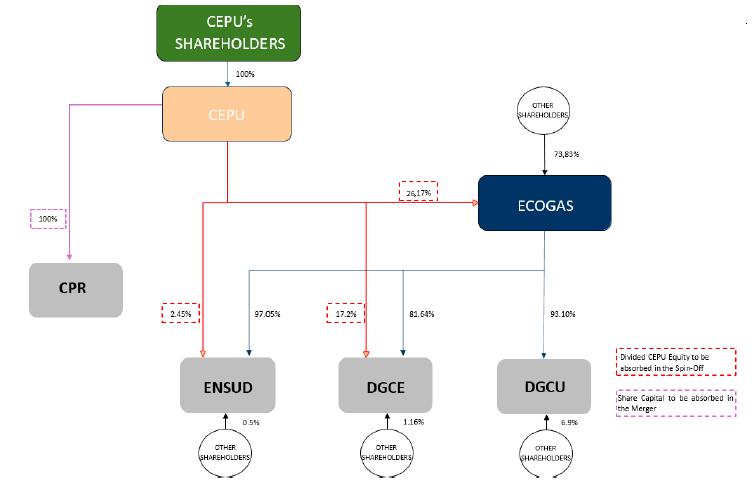 | 重组类型: | 根据并在遵守第88条及LGS相关章节所载规定的情况下进行分拆合并,据此,ECOGAS为吸收公司,并且就已分割的CEPU股权而言,CEPU为其股权应被吸收的公司。