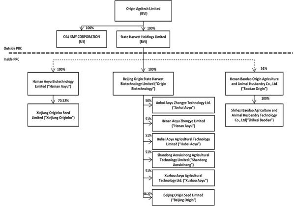投资者持股的公众公司奥瑞金种业股份有限公司,简称奥瑞金种业,是一家在英属维尔京群岛注册成立的控股公司。目前,我们所有的业务活动都是通过母公司奥瑞金种业以下的各种公司在中国开展的。我们的部分业务是通过可变利益企业或VIE在中国进行的。业务中属于VIE的部分为海南奥宇及其子公司。我们的运营余额是通过在Origin Biotechnology或在Origin Biotechnology下的全部和部分股权拥有的运营进行的,而Origin Biotechnology又是State Harvest Holdings Limited(“State Harvest”)拥有的100%股权。因为是多层控股公司结构,所有的运营公司都在中国,所以奥瑞金种业的一个投资者可能永远不会拥有这些中国公司的股权。
