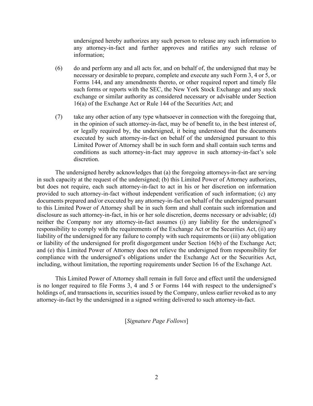 2下列签署人特此授权任何此类人向任何实际代理人发布任何此类信息,并进一步批准和批准任何此类信息发布;(6)为并代表以下签署人执行任何和所有可能有必要或可取的行为,以编制、填写和执行任何此类表格3、4或5,或表格144及其任何修订,或其他要求的报告,并及时向SEC提交此类表格或报告,根据《交易法》第16(a)条或《证券法》第144条被认为必要或可取的纽约证券交易所和任何证券交易所或类似机构;(7)就上述事项采取任何其他任何类型的行动,而该等事实上的律师认为,这些行动可能有利于、符合以下签署人的最佳利益或法律要求,据了解,该实际代理人根据本有限授权书代表以下签署人签署的文件应采用该实际代理人全权酌情批准的格式,并应包含该实际代理人可能批准的条款和条件。以下签署人在此确认:(a)上述事实上的律师是应以下签署人的请求以该身份服务的;(b)本有限授权书授权但不要求每一名该等事实上的律师根据提供给该事实上的律师的信息自行决定行事,而无需对该等信息进行独立核实;(c)任何事实上的律师根据本有限授权书代表以下签署人准备和/或签立的任何文件应采用该形式,并应包含该事实上的律师全权酌情决定的信息和披露,(d)公司或任何事实上的律师均不承担(i)以下签署人遵守《交易法》或《证券法》要求的责任的任何责任,(ii)以下签署人因未能遵守此类要求而承担的任何责任,或(iii)以下签署人根据《交易法》第16(b)节对利润返还承担的任何义务或责任;(e)本有限授权书并不免除以下签署人遵守《交易法》或《证券法》规定的义务的责任,包括但不限于,《交易法》第16条规定的报告要求。本有限授权书应保持完全有效,直至以下签署人不再被要求就以下签署人持有公司发行的证券和进行交易提交表格3、4和5或表格144,除非以下签署人以交付给该事实上的签署书面形式就任何事实上的代理人提前撤销。[签名页关注]