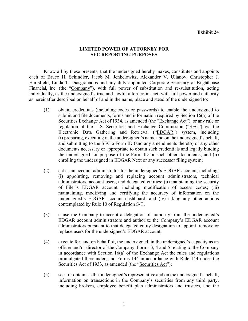 1 附件 24为SEC报告目的而行使的有限授权书由这些礼物所知,以下签署人特此制作、组成并任命Bruce H. Schindler、Jacob M. Jenkelowitz、Alexander V. Ulianov、Christopher J. Hartsfield、Linda T. Diasgranados和任何正式任命的公司秘书为Brighthouse Financial, Inc.(“公司”),具有完全的替代和重新替代权,单独行事,作为以下签署人的真实和合法的实际代理人,具有以下所述的完全权力和授权,代表并以其名义,(1)获得凭据(包括代码或密码),使以下签署人能够通过电子数据收集和检索(“EDGAR”)系统提交和归档经修订的1934年《证券交易法》(“交易法”)第16(a)条或美国证券交易委员会(“SEC”)的任何规则或条例要求的文件、表格和信息,包括(i)以以下签署人的名义和代表以下签署人准备、执行,并向SEC提交表格ID(及其任何修订)或任何其他必要或适当的文件,以获得此类凭据,并为表格ID或此类其他文件的目的对以下签署人具有法律约束力;(ii)在EDGAR Next或任何后续备案系统中注册以下签署人;(2)担任以下签署人的EDGAR账户的账户管理员,包括:(i)任命、解除和更换账户管理员、技术管理员、账户用户和受委托实体;(ii)维护Filer的EDGAR账户的安全性,包括修改访问代码;(iii)维护,修改和认证以下签署人的EDGAR账户仪表板上的信息的准确性;(iv)采取S-T条例第10条所设想的任何其他行动;(3)促使公司接受以下签署人的EDGAR账户管理员的授权,并授权公司的EDGAR账户管理员根据该受委托实体指定为以下签署人的EDGAR账户指定、移除或替换用户;(4)以以下签署人作为公司高级职员和/或董事的身份为并代表以下签署人执行表格3,根据《交易法》第16(a)节颁布的规则和条例,以及根据经修订的1933年《证券法》(“证券法”)第144条规定的表格144,与公司有关的第4和5条;(5)作为以下签署人的代表并代表以下签署人,从任何第三方(包括经纪人、员工福利计划管理人和受托人)寻求或获取有关公司证券交易的信息,以及