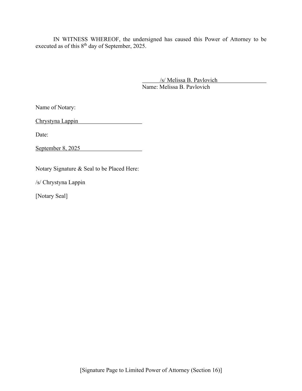 【有限授权书签署页(第16节)】作为见证,下列签署人已促使本授权书自2025年9月8日起执行。/s/Melissa B. Pavlovich姓名:Melissa B. Pavlovich公证员姓名:Chrystyna Lappin日期:2025年9月8日公证签字&印章在此放置:/s/Chrystyna Lappin [公证章]