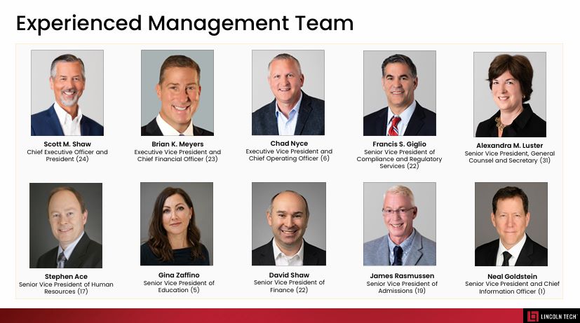 经验丰富的管理团队Scott M. Shaw首席执行官兼总裁(24)Brian K. Meyers执行副总裁兼David Shaw财务高级副总裁(23)Chad Nyce执行副总裁兼首席运营官(6)Stephen Ace人力资源高级副总裁(17)Francis S. Giglio合规和监管服务部高级副总裁(22)TERM0Alexandra M. Luster高级副总裁、总法律顾问和秘书(31)James Rasmussen招生高级副总裁(19)Neal Goldstein高级副总裁兼首席信息官(1)TERM4财务高级副总裁(22)Gina Zaffino教育高级副总裁(5)