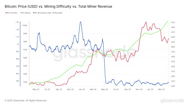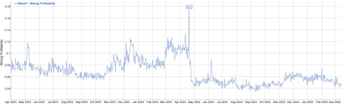 2023年4月至2025年3月的24个月期间,每1 Terahash每秒算力的比特币挖矿行业收入美元/天: