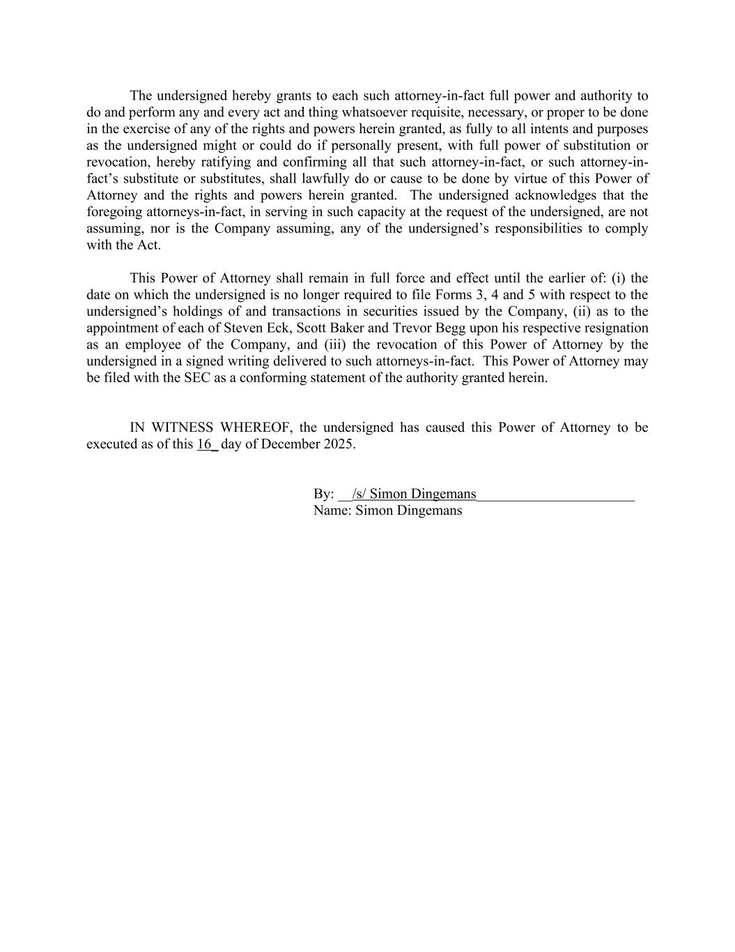 下列签署人特此授予每一名该等事实上的代理人全权和授权,以在行使本协议所授予的任何权利和权力时,完全按照以下签署人在亲自出席时可能或可能做的所有意图和目的,作出和执行任何必要、必要或适当的行为和事情,并具有完全的替代或撤销权力,特此批准和确认该等事实上的代理人或该等事实上的代理人的替代人或替代人的所有行为和事情,应凭藉本授权书及本授权书所授予的权利和权力合法地作出或促使作出。以下签署人承认,上述事实上的律师应以下签署人的请求以这种身份任职,并不是在承担,公司也不是在承担以下签署人遵守该法案的任何责任。本授权书将一直有效,直至以下较早者为止:(i)以下签署人不再被要求就以下签署人持有和交易公司发行的证券提交表格3、4和5的日期,(ii)关于Steven Eck、Scott Baker和Trevor Begg各自辞去公司雇员职务后各自的任命,以及(iii)以下签署人以交付给该等事实上的律师的签署书面形式撤销本授权书。本授权书可作为此处授予的权限的符合声明提交给SEC。下列签署人已安排自2025年12月16日起执行本授权书,以作为证明。作者:__/s/Simon Dingemans __________________________姓名:Simon Dingemans