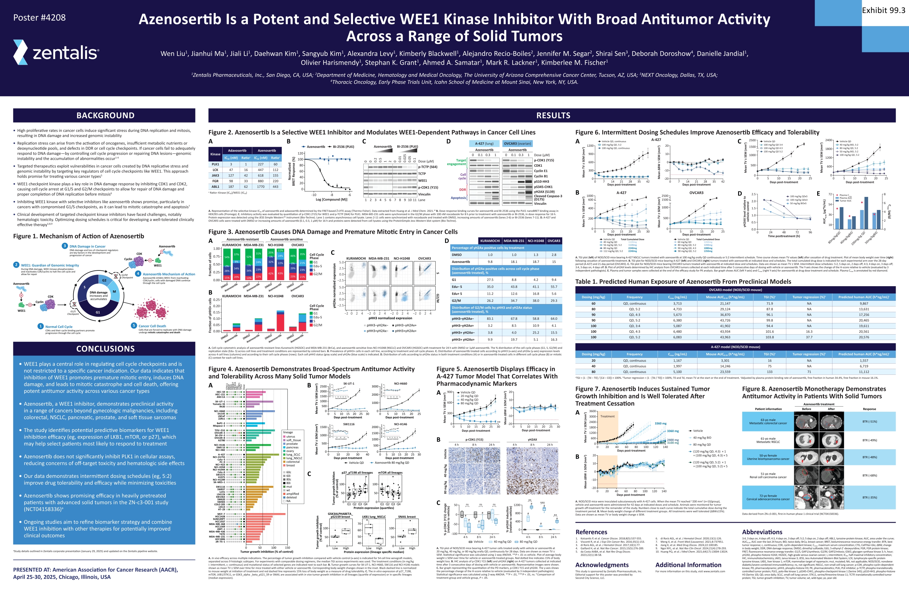 图2。Azenosertib是一种选择性WEE1抑制剂,可调节癌细胞系中的WEE1相关通路-10-8-6 000.10.3 100。2 0.5 1 2 0 0.01 0.02 5 0.05 0.1123456789 1011剂量(μ M)剂量(μ M)p-CDK1(Y15)靶点接合CDK1 Cyclin E1 Cyclin B1 pS10-HH3 pS345-CHK1 γ H2AX(S139)裂解caspase-3(D175)Vinculin Lane p-TCTP(S64)TCTP WEE1 p-CDK1(Y15)Vinculin 20406080100120 log [化合物(M)] Azenosertib Azenosertib A-427(肺)BI-2536(PLKi)N或m al iz ed BR ET re sp on se(%)00.10.31 Azenosertib OVCAR3(卵巢)DDR凋亡细胞周期Azenosertib和adavosertib通过基于FRET的Z á I-LYTE测定法(赛默飞世尔)测定。数据提取自Huang et al. J Med Chem。2021.10 B.在HEK293细胞(Promega)中使用PLK1 nanoBRET结合试验的azenosertib和BI-2536的剂量反应结合曲线。C. WEE1用p-CDK1(Y15)定量、PLK1用p-TCTP(S64)定量评价抑制活性。用azenosertib或BI-2536治疗前用100 nM诺考达唑在G2/M期同步MDA-MD-231细胞8小时,剂量反应16小时。使用JESS Simple Western检测蛋白表达™instrument(Bio-Techne)。Lane 1包含异步细胞裂解物。LANES2-11细胞与诺可达唑同步,用DMSO处理,增加azenosertib(LANES2-6)或BI-2536(LANES7-11)的量。D. A-427和OVCAR3细胞用DMSO或增加量的azenosertib(0.1,0.3,1 μ M)处理16小时,并使用ProteinSimple Jess Western印迹系统(Bio-Techne)从细胞裂解物中检测蛋白质。图3。Azenosertib导致DNA损伤和癌细胞中的过早有丝分裂进入0.00 0.25 0.50 0.75 1.00 Fr ac ti on o f c el ls Azenosertib耐药Azenosertib敏感KURAMOCHI MDA-MB-231 NCI-H1048 OVCAR3 0.00 0.05 0.10 0.15 0.20 0.25 DMSO Fr ac ti on o f p H H 3 + c el ls Azenosertib DMSO Azenosertib DMSO Azenosertib DMSO KURAMOCHI MDA-MB-231 NCI-H1048 OVCAR3 Azenosertib DMSO Azenosertib DMSO Azenosertib KURAMOCHI MDA-MB-231 NCI-H1048标准化表达γ H 2A x no rm al iz ed e xp re ss io n 54% 37% 52% 31% 25% 11% 46% 35% 2% 9% 1% 24% 1% 24% 24% 2% 21% 28% 34% 23% 32% 22% 29% 23% 15% 20% 13% 22% 42% 43% 23% 21% G1细胞周期期EDU-S S G2/M G1细胞周期期EDU-S G2/M PHH3 − γ H2Ax − PHH3 − γ H2Ax + PHH3 + γ H2Ax − PHH3 + γ H2Ax + A B C D A. azenosertib耐药系Kuramochi(HGSOC)和MDAI-MB-22A的细胞周期细胞仪分析和azenosertib敏感线NCI-H1048(NSCLC)和OVCAR3(HGSOC)联合DMSO或1 μ M azenosertib治疗24小时。细胞周期阶段(G1、S、G2/M)和复制状态(EDU-S)在细胞系和处理条件上的百分比分布用彩色条形图表示。B.各细胞系PHH3 +细胞流行率, 根据治疗和细胞周期阶段。C. azenosertib处理过的细胞在4个细胞系(柱)上按PHH3(x丨轴)和γ H2Ax(y丨轴)表达水平分布,并按其细胞周期阶段(行)分布。每个细胞PHH3状态(灰阶)和γ H2AX(蓝阶)都有注明。D.根据γ H2AX状态在两种处理条件(A)中或在不同细胞周期阶段(B)或有丝分裂(C)环境下的azenosertib处理过的细胞中对每个细胞系的细胞分布。图4。Azenosertib表现出广谱抗肿瘤活性多种实体瘤模型的耐受性和耐受性05 1015202530-20-10 01020天治疗后M EA n ↓ BW ± S EM(m m3)05 10152025-20-10 01020天治疗后M EA n ↓ BW ± S EM(m m3)010203040-20-10 01020天治疗后M EA n ↓ BW ± S EM(m m3)05 1015202530-20-10 01020天治疗后M EA n ↓BW ± S EM(mm3)D OS e TP 53 CC N E1 RB 1 PI K3丨CA 丨加利福尼亚州 FB XW 7 KR A S BR A F ST K1 1 ZR − 75 − 1 HCC1806 MDA − MB − 231 T47D MDA − MB − 436 JIMT − 1 HCC1569 MDA − MB − 468 HCC1937 SUM149PT HCC1428 MCF − 7 HT − 29 LS513 COLO 205 SW403 SW620 SW1463 LS411N lovo SW837 SW1116 SK − MES − 1 NCI − H1299 H1975 SW1573 Calu − 6 NCI − H1944 NCI − H358 NCI − H23 PC − 9 Calu − 3 NCI对照)05 10152025300500100015002000250005 101520250100020003000001020304005001000150005 10152025300500100015002000天治疗后M EA n TV ± S EM(m m 3)M EA n TV ± S EM(m m 3)治疗后天数治疗后天数5010050100 Q1 Q2 Q3 Q4蛋白表达(四分位数)Tu m或g ro w th in hi bi ti on(% o f c on tr ol)00 tu m或g ro w th in hi bi ti on(% o f c on tr ol)Q1 Q2 Q3 Q4低高蛋白表达(谱系特异性中值)低高低高p27 _ pT198所有谱系mTOR所有谱系GSK3ALPHABETA _ pS21S9乳腺LKB1肺_ NSCLC SNAIL乳腺SK-UT-1 NCI-H660 SW1116 NCI-H146 40506070501000501000谱系乳腺结直肠肺_ NSCLC肺_ SCLC卵巢胰腺前列腺软_组织子宫60c 60i 80c 80i mut wt扩增缺失NA载体QD azenosertib 80 mg/kg 丨QD A B C A.跨多个适应症的体内疗效。与载体对照(x轴)相比,肿瘤生长抑制的百分比用于54个细胞系异种移植模型,在9个组织学亚型中分离。对于具有可比给药方案的实验,使用跨实验的中值TGI。各条旁注明所选基因的治疗条件(单位:mg/kg i:间歇,c:连续)和突变状态。B. SK-UT-1、NCI-H660、SW116和NCI-H146模型的肿瘤生长曲线显示为接受载体或azenosertib治疗的小鼠随时间的平均TV ± SEM。相应的体重变化如插图所示。黑色虚线在开始治疗时归一化为小鼠体重,红色虚线代表体重损失15%,作为药物耐受性的衡量标准。C. p27 _ T198、mTOR、LKB1/STK11或GSK3 _ alpha _ beta _ pS21 _ S9或SNAIL的体外表达与所有谱系(表达的四分位数)或特定谱系(中位表达)的体内肿瘤生长抑制有关。图5。Azenosertib在与药效学标志物M EA n TV ± S EM(m m 3)相关的A-427肿瘤模型中显示疗效80 m g/kg 40 m g/kg V eh ic le 4 h 8 h 24 h 4 h 8 h 8 h 24 h m ea n ↓ BW ± S EM(m m 3)05 10152025300600900治疗后p-CDK1(Y15)γ H2AX**05 1015202530-20-10 01020天后处理4小时8小时24小时-100-50 050% p-CD K1(Y 15)ch an ge(r el ati ve to ve hi cl e)4 h 8 h 24 h 04008001200% γ H 2A X in du cti on(r el ati ve to ve hi cl e)ns ns ns # # #*******# # # #载体QD 20mg/kg QD 40mg/kg QD 80mg/kg QD载体40mg/kg QD 80mg/kg载a-427肿瘤细胞的NOD/SCID小鼠口服载体治疗的QD A-B C A TGI图或azenosertib口服20mg/kg、40mg/kg或80mg/kg QD,连续28天。数据显示为平均电视± SEM。采用1向方差分析法计算统计显著性。**P <.01 vs车辆。载体或azenose