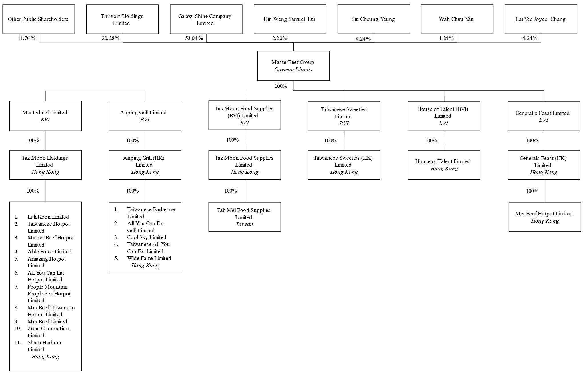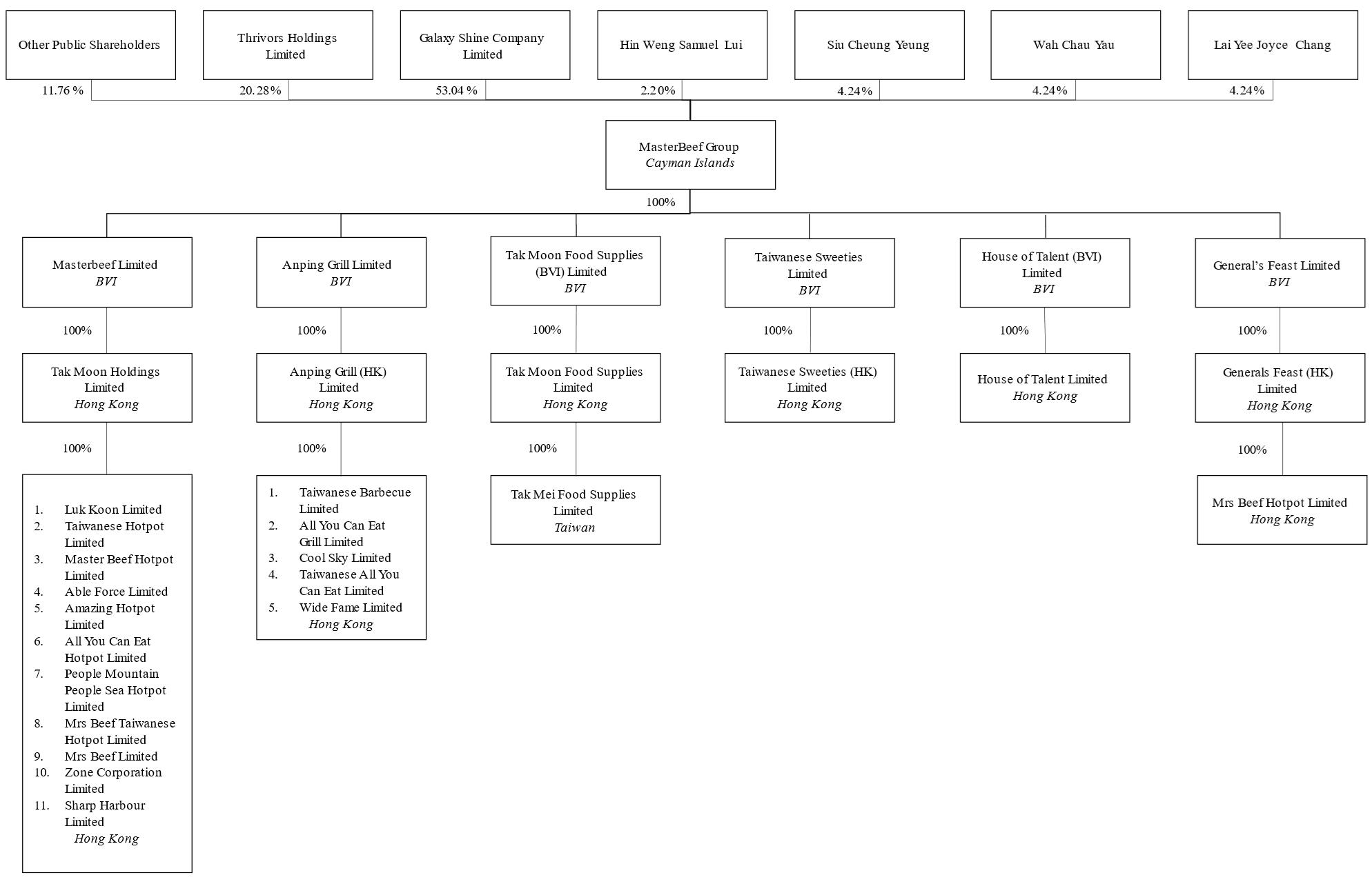 该公司是一家在开曼群岛注册成立的控股公司。作为一家控股公司,其自身并无实质性业务,通过BVI全资子公司在香港开展业务,包括Masterbeef Limited、Anping Grill Limited、Tak Moon Food Supplies(BVI)Limited、Taiwanese Sweeties Limited、House of Talent(BVI)Limited和General’s Feast Limited,而后者又在香港拥有全资子公司,包括在香港运营的约20家运营子公司(统称“香港运营子公司”),以及在台湾运营的1家运营子公司(连同香港运营子公司,“运营子公司”)。本次发售的股份为公司股份,为一家开曼群岛控股公司,而非营运附属公司的股份。本次发行的投资者将不直接持有任何一家运营子公司的股权。