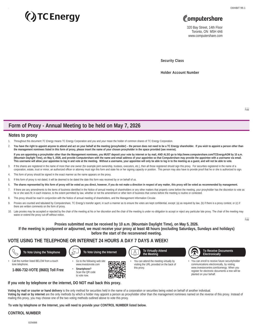用电话投票用网络投票虚拟出席会议。0256BB折叠式委托书-将于2026年5月7日举行的年会每周7天每天24小时使用电话或互联网进行投票!如果您通过电话或互联网投票,请不要邮寄回此代理。以邮寄或快递或专人递送方式进行投票,是以公司名义持有的证券或代表另一个人进行投票的证券的唯一方式。通过邮寄或互联网投票是持有人可以指定除本委托书背面指定的管理层提名人以外的人作为代理持有人的唯一方法。您可以选择上面概述的两种投票方式中的一种,而不是邮寄这份委托书,来对这份委托书进行投票。。•您可以通过访问www.investorcentre.com/tcenergy以电子方式注册接收未来的证券持有人通信。当你注册电子文件时,会代你种一棵树。。要通过电话或互联网投票,您需要提供下面列出的您的控制号码。控制编号1。在本文件通篇中,TC Energy是指TC Energy Corporation,而您和您的意思是TC Energy Corporation普通股的持有人。2.您有权指定任何人出席会议并代您行事(代理持有人)–该人不必是TC Energy股东。如果您希望任命除本代理表格中列出的管理层提名人之外的其他人员,请在提供的空格中插入您选择的代理持有人的姓名(见背面)。如果您正在任命除管理层提名人之外的代理持有人,您必须通过互联网或邮寄方式存入您的投票,并且还必须在2026年5月5日上午10点(山区夏令时间)之前前往http://www.computershare.com/TCEnergyAGM,并向Computershare提供您被任命者的姓名和电子邮件地址,以便Computershare可以通过电子邮件向被任命者提供用户名。这个用户名将允许您的被任命者登录并在会议上投票。没有用户名,你的被任命者只能以嘉宾身份登录会议,无法投票。3.如果股份是以不止一个所有者(例如共同所有权、受托人、被执行人等)的名义登记的,那么所有登记的人都应该签署这份委托书。对于以公司、遗产、信托或未成年人名义登记的证券,授权人员或律师必须在此表格上签字,并说明其签字能力或地位。此人还可能需要提供他或她被授权签字的证明。4.这种代理形式应以代理上出现的名称的确切方式签署。5.如果这份委托书没有注明日期,则将被视为日期为我们或代表我们收到这份表格的日期。6.此表格代表的股份将按您的指示进行投票,但是,如果您没有就任何事项作出指示,此代表将按管理层的建议进行投票。7.如对年度股东大会通知中确定的事项或任何其他适当提交会议的事项有任何修改,贵方的代理持有人可酌情酌情酌情投票;在每种情况下,在法律允许的范围内,无论提交会议的修改或其他事项是否例行或有争议。8.本委托书应与《年度股东大会通知》、《管理层信息通函》一并阅读。9.代理人由TC Energy的转让代理机构ComputerShare以确保对投票保密的方式进行统计和制表,但以下情况除外:(a)根据法律规定,(b)如果有代理竞争,或(c)如果对代理形式有书面意见。10.迟交的代理人可由会议主席酌情接受或拒绝,会议主席没有义务接受或拒绝任何特定的迟交代理人。会议主席可在不发出通知的情况下放弃或延长代理截止期。提交的代理必须在2026年5月5日上午10点(山区夏令时间)之前收到。如果会议延期或延期,我们必须在续会开始前至少48小时(不包括周六、周日和节假日)收到您的委托代理人。代理注意事项•通过按键式电话拨打以下所列号码。•上以下网址:www.investorvote.com •智能手机?马上扫码投票。•您可以通过访问此代理背面提供的URL以虚拟方式参加会议。以电子方式接收文件320 Bay Street,14th Floor Toronto,on M5H 4A6 www.computershare.com 000001 Security Class 123 C1234567890 X X X持有人帐号MR SAM SAMPLE 123 SAMPLES STREET SAMPLETOWN SS X9X 9X9 CPUQC01.E.INT/000001/i1234 123456789012345 1-866-732-vote(8683)免费电话Exhibit 99.1