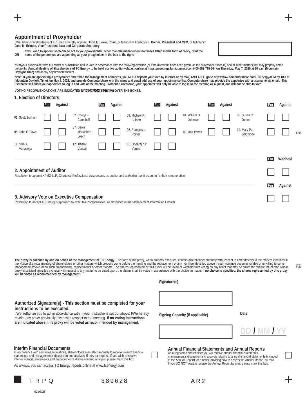 .0256CB389628折任命代理持有人为我/我们的代理持有人并具有完全替代权,可以按照以下指示投票(或者,如果没有给出指示,视代理持有人认为合适而定),以及在将于2026年5月7日(星期四)上午10点(山区夏令时间)及任何休会时间通过在线现场音频网络直播方式召开的TC Energy年度股东大会之前可能适当提交的所有其他事项。如果您希望任命某人担任您的代理持有人,除本代理表格中列出的管理层提名人外,请在右侧方框中打印您任命为您的代理持有人的人的姓名:或者我/我们,作为TC Energy的股东,特此任命:丨John E. Lowe John E. Lowe,主席,或未达到其总裁兼首席执行官François L. Poirier,或未达到其副总裁、法律和公司秘书Jane M. Brindle的授权签名-必须填写本节,您的指示才能得到执行。I/We authorize you to act according to my/our instructions set above。我/我们特此撤销之前就会议给出的任何代理。如果上面没有显示投票指示,这位代理人将按照管理层的建议进行投票。与往常一样,您可以在www.tcenergy.com在线查阅TC Energy报告中期财务文件根据证券法规,股东可以选择每年接收中期财务报表以及管理层的讨论和分析,如果他们要求的话。如果您希望收到中期财务报表和管理层的讨论和分析,请在此框中标记:年度财务报表和年度报告作为注册股东,您将通过邮件收到年度财务报表、管理层与年度财务报表相关的讨论和分析(包括在年度报告中),或告知如何访问年度报告的通知。如果您不想通过邮寄方式收到年度报告,请在此框中标记:A R 2 DD/mm/YY DateSigning Capacity(if Applicable)Signature(s)2。委任核数师决议委任KPMG LLP、特许专业会计师为核数师及授权董事厘定其薪酬。1.选举董事反对04。William D. Johnson 05。Susan C. Jones 09。Una Power 10。Mary Pat Salomone反对03。Michael R. Culbert 08。François L. Poirier 13。Dheeraj“d”Verma Against for 02。Cheryl F. Campbell 07。Dawn Madahbee Leach 12。Thierry Vandal反对01。斯科特·博纳姆06。John E. Lowe 11. 11。Withdown for the proxy of Siim A. Vanaselja是由TC Energy的管理层征集并代表其进行的。本委任表格在妥善执行后,授予就股东周年大会通知所指事项的修订或适当提交会议的其他事项的酌处权,以及在上述任何代名人无法或不愿任职的情况下更换该代名人。管理层不知道有任何此类修订、替换或其他事项。该代理人所代表的股份将在可能要求的任何投票中被投票或被拒绝投票。凡被征召代表的人就任何待表决事项指明选择,则该股份应按照如此作出的选择进行表决。如果没有具体选择,该代理人所代表的股份将按照管理层的建议进行投票。注意:如果您正在任命除管理层提名之外的代理持有人,您必须通过互联网或邮寄方式存入您的投票,还必须在2026年5月5日上午10点(山区夏令时间)之前前往http://www.computershare.com/TCEnergyAGM,并向Computershare提供您被任命者的姓名和电子邮件地址,以便Computershare可以通过电子邮件向被任命者提供用户名。该用户名将允许您的被任命者登录并在会议上投票。没有用户名,您的被任命者将只能以嘉宾身份登录会议,无法投票。投票建议由方框上的突出文字表示。3.就高管薪酬决议进行咨询投票以接受TC Energy的高管薪酬方法,详见管理层信息通函。AgainstFor MR SAM SAMPLE 123 C1234567890 XXX 999999999999 X XT R P Q