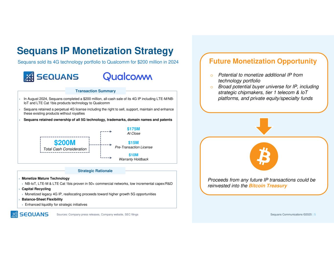 Sequans IP货币化战略来源:公司新闻稿、公司网站、SEC文件丨将成熟技术货币化丨NB-IoT、LTE-M & LTE Cat 1bis在50 +商用网络中得到验证,增量资本支出/研发费用较低丨资本回收丨货币化的传统4G IP,将收益重新分配给更高增长的5G机会丨资产负债表灵活性丨增强战略举措的流动性战略理由Sequans在2024年以2亿美元的价格将其4G技术组合出售给高通,截至收盘时,任何未来IP交易的收益都可以再投资1.75亿美元到比特币国库,总现金对价为2亿美元,总现金对价为1000万美元的质保保留1500万美元的交易前许可↓ 2024年8月,Sequans完成了以2亿美元全现金方式将其包括LTE-M/NB-IoT和LTE Cat 1bis产品技术的4G IP技术出售给丨高通丨丨Sequans保留了永久的4G许可,包括出售、支持、维护和增强这些现有产品,无需支付版税↓ Sequans保留对所有5G技术、商标、域名和专利的所有权交易摘要未来的货币化机会o将技术组合中的额外IP货币化的潜力o IP的广泛潜在买家范围,包括战略芯片制造商、一级电信和物联网平台以及私募股权/专业基金Sequans通信©2025 | 5