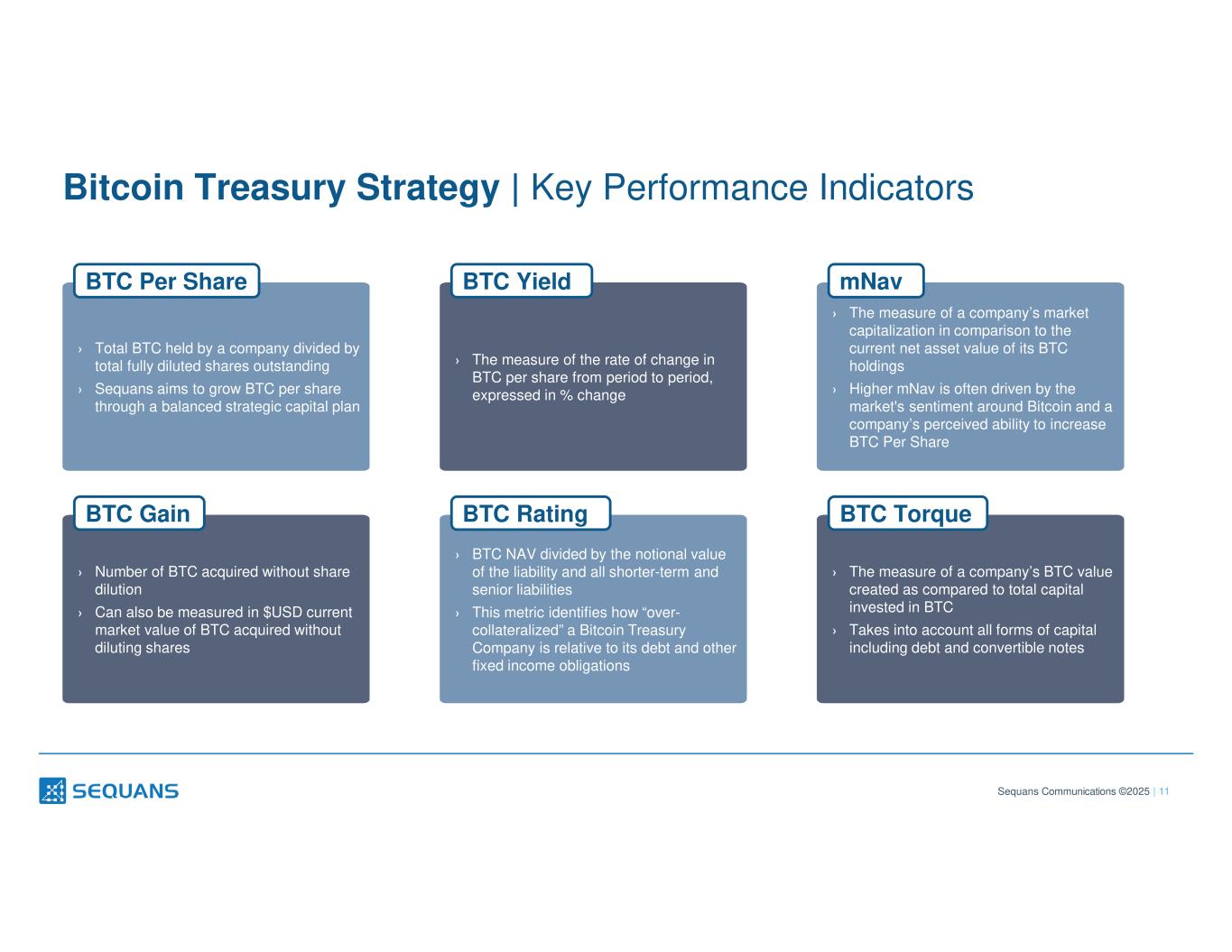 比特币国债策略|关键绩效指标丨一家公司持有的BTC总额除以完全稀释的已发行股份总额丨Sequans旨在通过均衡的战略资本计划实现每股BTC增长↓衡量一家公司创造的BTC价值与投资于BTC的总资本之比丨考虑到包括债务在内的所有形式的资本和可转换票据BTC扭矩↓衡量一家公司的市值与其所持BTC的当前资产净值的比较↓较高的MNAV通常是由市场对比特币的情绪和一家公司认为有能力增加BTC每股MNAV推动的↓在不稀释股份的情况下获得的BTC数量↓也可以在不稀释股份的情况下以所获得的BTC的当前市值美元衡量BTC增益丨BTC NAV除以负债的名义价值和所有较短期和优先负债↓该指标可识别比特币国库公司相对于其债务和其他固定收益债务的“超额抵押”程度BTC评级↓衡量不同时期每股BTC变化率的指标,以%变化BTC收益率表示Sequans通信©2025 | 11
