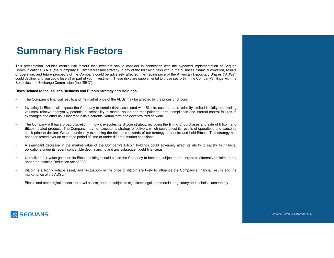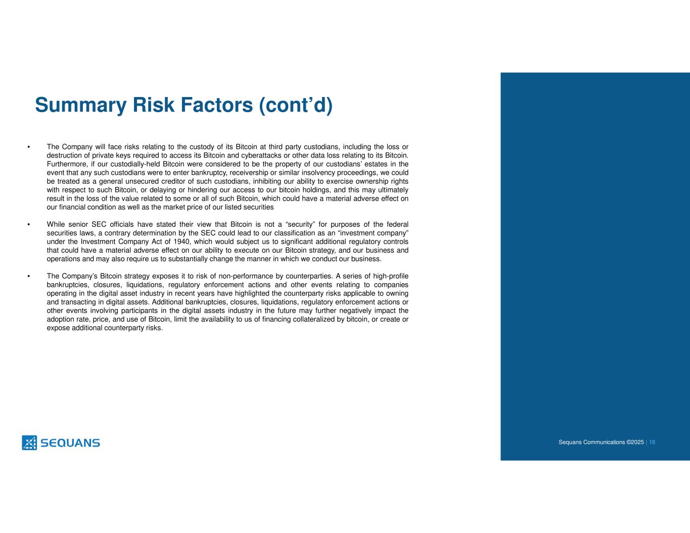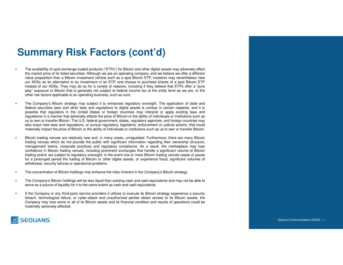 风险因素汇总Sequans通信©2025 | 16本演示文稿包含投资者在Sequan Communications S.A.(“公司”)比特币金库战略的预期实施过程中应考虑的某些风险因素。如果发生以下任何风险,公司的业务、财务状况、经营业绩和未来前景可能受到不利影响,美国存托股票(“ADS”)的交易价格可能会下降,您可能会损失全部或部分投资。这些风险是公司向美国证券交易委员会(“SEC”)提交的文件中所述风险的补充。与发行人业务和比特币战略及持股相关的风险•公司的财务业绩和ADS的市场价格可能会受到比特币价格的影响。•投资比特币将使公司面临与比特币相关的某些风险,例如价格波动、有限的流动性和交易量、相对匿名性、可能受到市场滥用和操纵、盗窃、交易所的合规和内部控制故障以及其电子、虚拟形式和去中心化网络中固有的其他风险。•该公司将在如何执行其比特币战略方面拥有广泛的自由裁量权,包括购买和销售比特币和比特币相关产品的时间安排。该公司可能无法有效执行其战略,从而影响其经营业绩,并导致其股价下滑。我们正在不断审视获取和持有比特币的策略的风险和回报。这一策略没有经过长时间的测试,也没有在不同的市场条件下进行测试。•公司持有的比特币市值大幅下降可能会对其履行近期可转换债务融资和任何后续债务融资下的财务义务的能力产生不利影响。•持有的比特币未实现公允价值收益可能导致公司根据2022年《降低通胀法》缴纳企业替代最低税。•比特币是一种高度波动的资产,比特币价格的波动很可能会影响公司的财务业绩和ADS的市场价格。•比特币和其他数字资产是新型资产,受到重大法律、商业、监管和技术不确定性的影响。