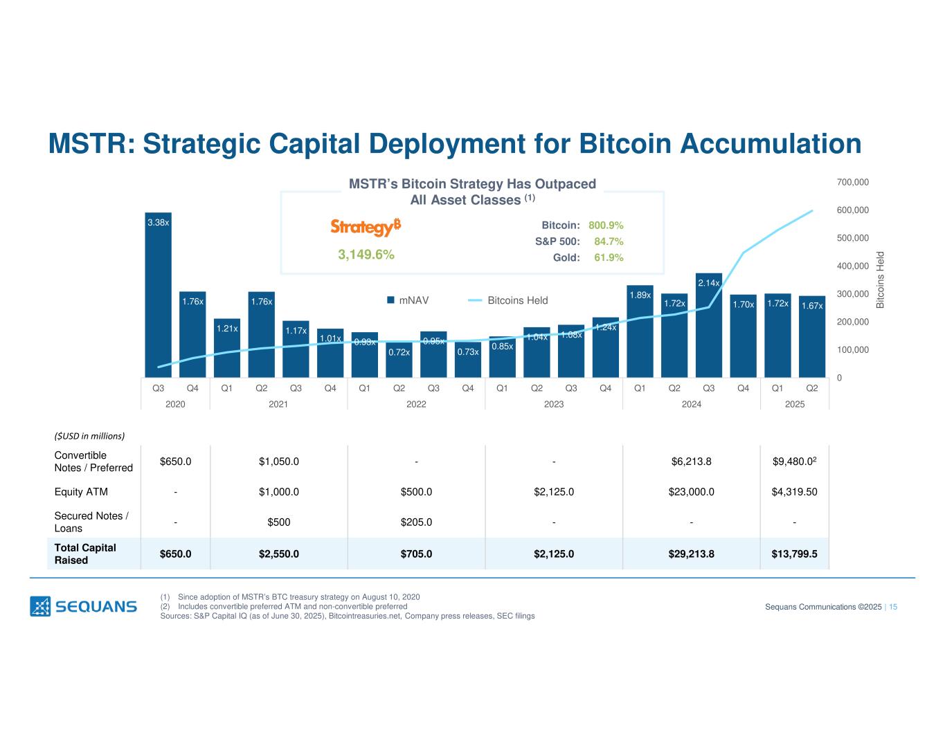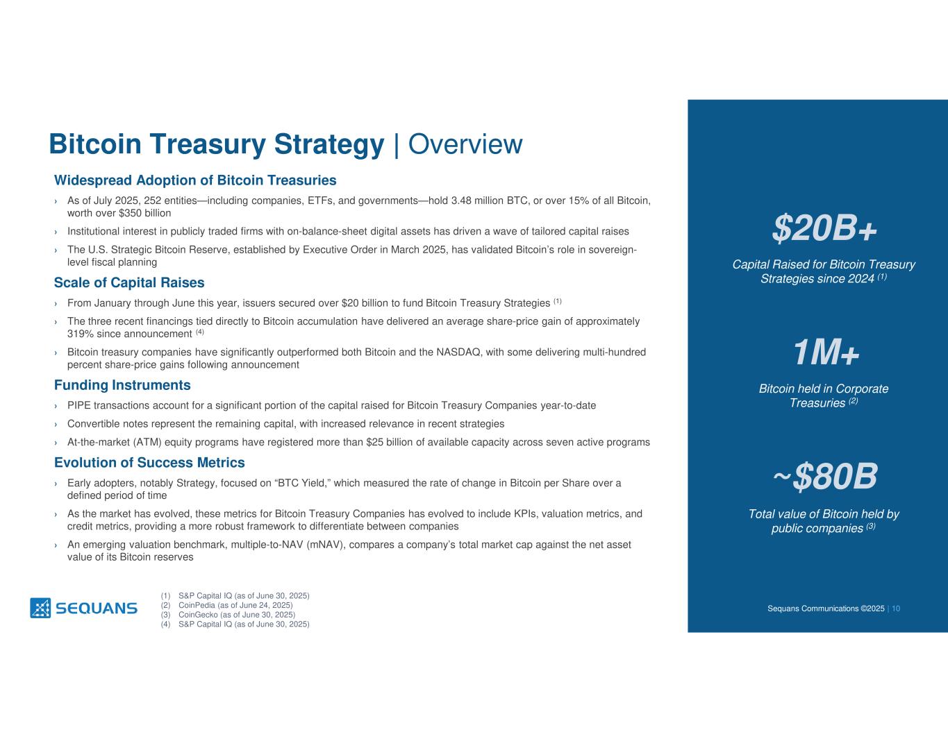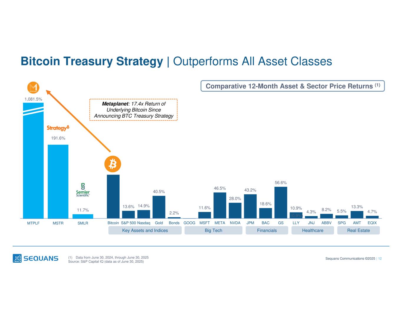 78.2% 13.6% 14.9% 40.5% 2.2% 11.6% 46.5% 28.0% 43.2% 18.6% 56.6% 10.9% 4.3% 8.2% 5.5% 13.3% 4.7%比特币标普 500 纳斯达克黄金债券MSFT META NVDATERM4 JPM BAC GS TERM5 GS LLYJNJTERM7TERM7TERMABVABBVTERM8TERMSPGSPG AMT EQIX(0.9%)191.6% 11.7% MTPLF MSTRSMLR Bitcoin Treasury Strategy |表现优于所有资产类别(1)2024年6月30日至2025年6月30日数据来源:TERM02025)关键资产和指数大科技金融医疗保健房地产1,081.5% Metaplanet:自公布BTC Treasury Strategy以来标的比特币的17.4倍回报Sequans通信©2025 | 12个月资产&板块价格回报率对比(一)