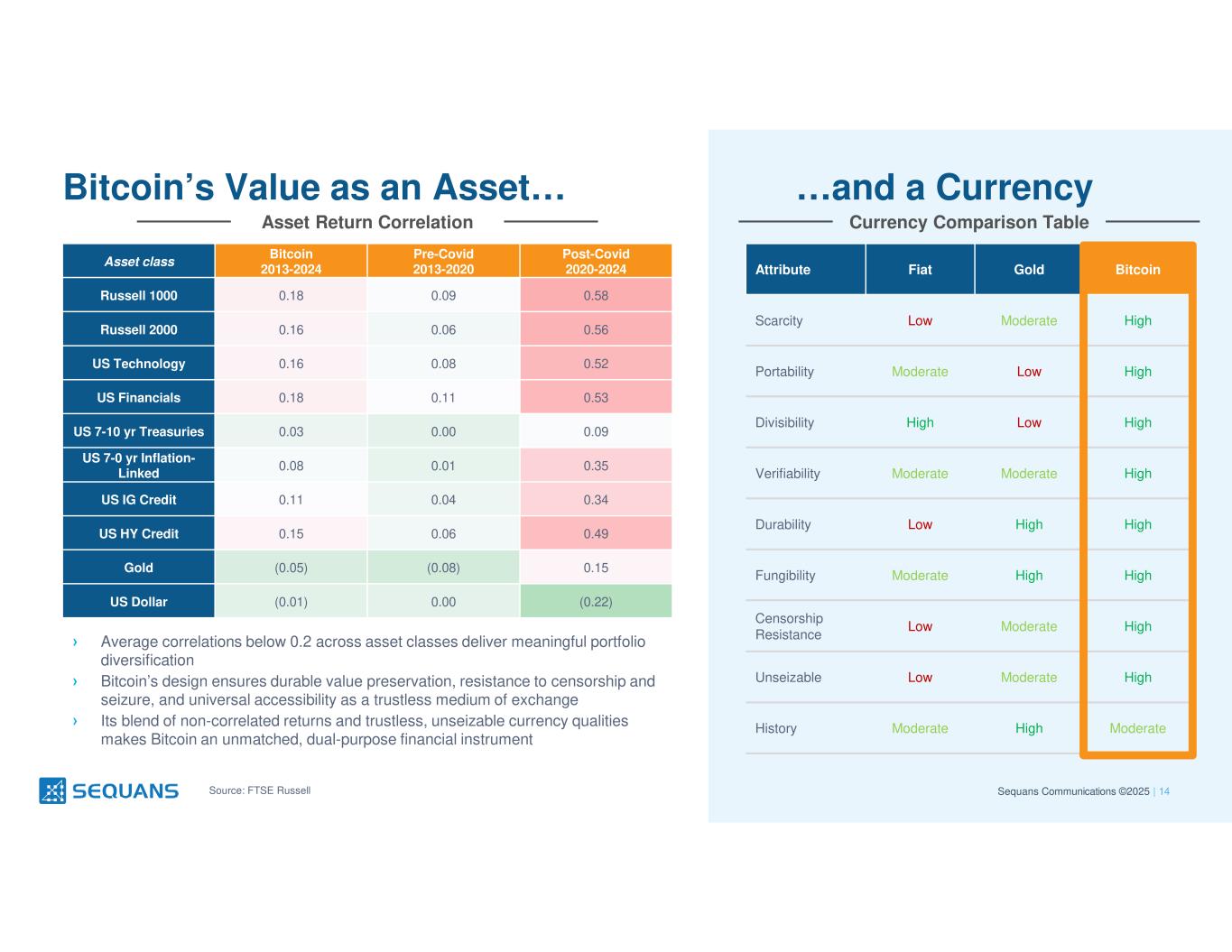 比特币作为资产的价值…BitcoinGoldFiatAttribute HighModerateLowScarcity HighLowModeratePortability HighLowHighDivisibility HighModerateVerifiability HighHighLowDurability HighModerateFungibility HighModerateLow审查阻力HighModerateLowUnseizable ModerateHighModerateHistory Currency Comparison Table…and a currency asset return relationship丨Average correlationship below below 0.2 across asset classes delives meaningful portfolio diversification丨比特币的设计双重用途金融工具来源:FTSE Russell Post-Covid 2020-2024 Pre-Covid 2013-2020 Bitcoin 2013-2024 Asset Class 0.58 0.09 0.18 Russell 10000.56 0.06 0.16 Russell 20000.52 0.08 0.16 US Technology 0.53 0.1 10.18 US Financials 0.09 0.00 0.03 US 7-10年国债0.35 0.01 0.08 US 7-0年与通胀挂钩的0.34 0.04 0.11 US IG Credit 0.49 0.06 0.15 US HY Credit 0.15(0.08)(0.05)Gold(0.22)0.00(0.01)USD Sequans通信©2025 | 14