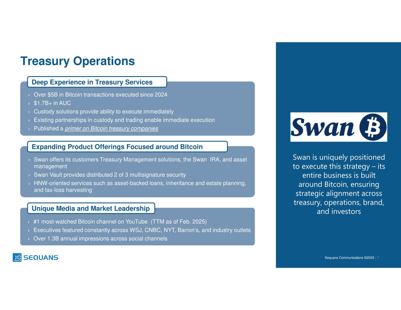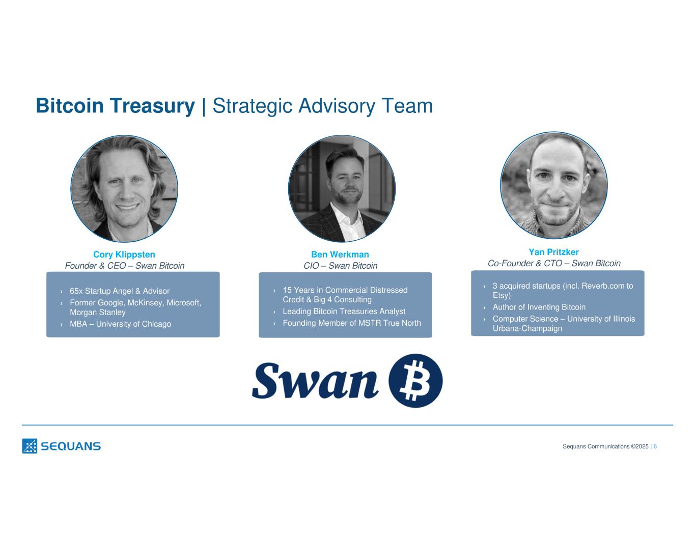 比特币宝库|战略顾问团队Cory Klippsten创始人兼首席执行官– Swan Bitcoin ↓ 65x Startup Angel & Advisor丨前谷歌、麦肯锡、微软、摩根士丹利 ↓ MBA –芝加哥大学Yan Pritzker联合创始人兼CTO – Swan Bitcoin ↓ 3家收购的初创公司(包括Reverb.com to Etsy)丨发明比特币的作者丨计算机科学–伊利诺伊大学厄巴纳-香槟分校丨15年商业困境信贷&四大咨询丨领先的比特币国债分析师丨MSTR True North创始成员Ben Werkman CIO – Swan Bitcoin丨Sequans Communications 丨Sequans通信©2025 | 6
