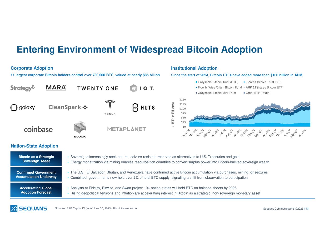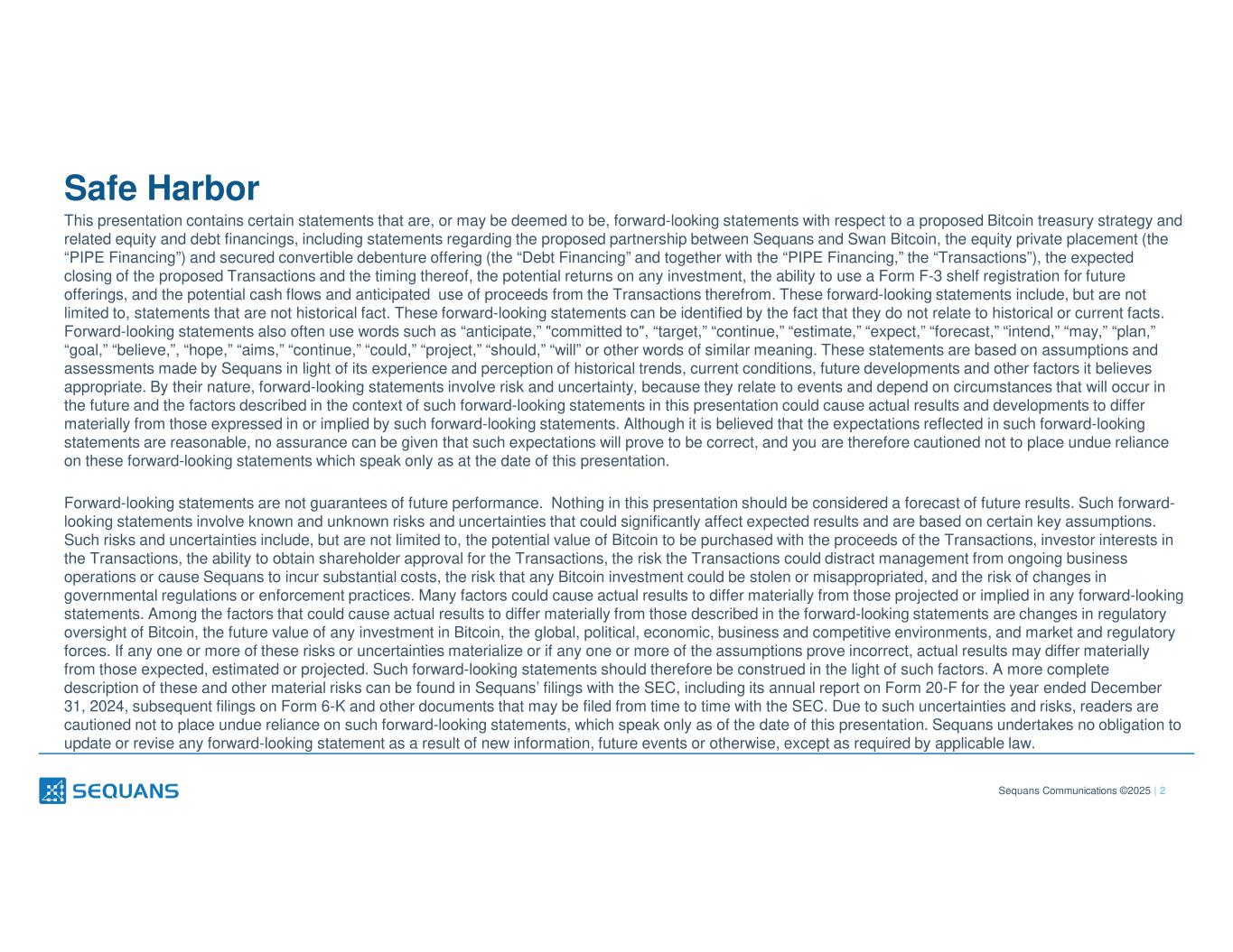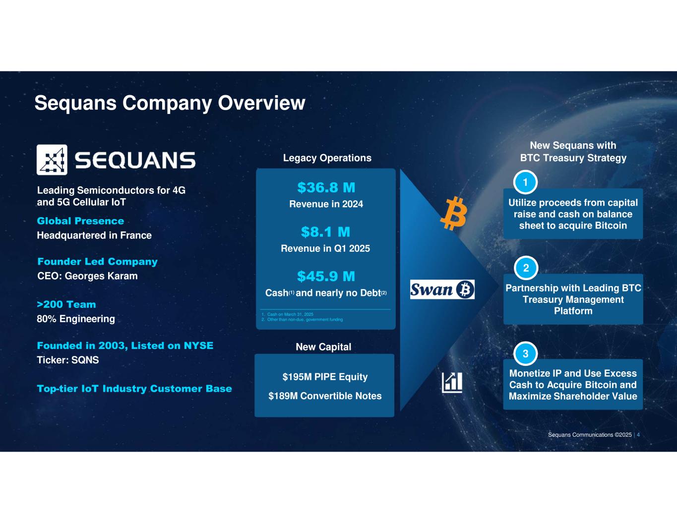 Safe Harbor本演示文稿包含的某些陈述是或可能被视为与拟议的比特币金库战略以及相关股权和债务融资有关的前瞻性陈述,包括关于Sequans与Swan Bitcoin之间拟议的合作伙伴关系、股权私募(“PIPE融资”)和有担保可转换债券发行(“债务融资”,以及与“PIPE融资,“交易”)、拟议交易的预期完成及其时间、任何投资的潜在回报、为未来发售使用F-3表格货架登记的能力,以及交易所得款项的潜在现金流和预期用途。这些前瞻性陈述包括但不限于非历史事实的陈述。这些前瞻性陈述可以通过与历史或当前事实无关这一事实来识别。前瞻性陈述还经常使用诸如“预期”、“承诺”、“目标”、“继续”、“估计”、“预期”、“预测”、“打算”、“可能”、“计划”、“目标”、“相信”、“希望”、“目标”、“继续”、“可能”、“项目”、“应该”、“将”或其他类似含义的词语。这些陈述是基于Sequans根据其经验和对历史趋势、当前状况、未来发展和它认为适当的其他因素的看法作出的假设和评估。就其性质而言,前瞻性陈述涉及风险和不确定性,因为它们与事件相关,并取决于未来将发生的情况,而本演示文稿中此类前瞻性陈述上下文中描述的因素可能导致实际结果和发展与此类前瞻性陈述中明示或暗示的结果和发展存在重大差异。尽管人们认为此类前瞻性陈述中反映的预期是合理的,但无法保证此类预期将被证明是正确的,因此请注意不要过分依赖这些仅在本演示文稿发布之日发表的前瞻性陈述。前瞻性陈述并非对未来业绩的保证。本演示文稿中的任何内容都不应被视为对未来结果的预测。此类前瞻性陈述涉及可能对预期结果产生重大影响的已知和未知风险和不确定性,并基于某些关键假设。此类风险和不确定性包括但不限于用交易收益购买的比特币的潜在价值、投资者在交易中的利益、交易获得股东批准的能力、交易可能分散管理层对持续业务运营的注意力或导致Sequans产生大量成本的风险、任何比特币投资可能被窃取或挪用的风险,以及政府法规或执法实践发生变化的风险。许多因素可能导致实际结果与任何前瞻性陈述中预测或暗示的结果存在重大差异。可能导致实际结果与前瞻性陈述中描述的结果存在重大差异的因素包括比特币监管监管的变化、比特币任何投资的未来价值、全球、政治、经济、商业和竞争环境以及市场和监管力量。如果这些风险或不确定性中的任何一项或多项成为现实,或者任何一项或多项假设被证明不正确,则实际结果可能与预期、估计或预测的结果存在重大差异。因此,应根据这些因素来解释此类前瞻性陈述。有关这些和其他重大风险的更完整描述可以在Sequans提交给SEC的文件中找到,包括其截至2024年12月31日止年度的20-F表格年度报告、随后提交的6-K表格文件以及可能不时向SEC提交的其他文件。由于此类不确定性和风险,请读者注意不要过分依赖此类前瞻性陈述,这些陈述仅在本演示文稿发布之日起生效。Sequans不承担因新信息、未来事件或其他原因而更新或修改任何前瞻性陈述的义务,除非适用法律要求。Sequans通信©2025 | 2