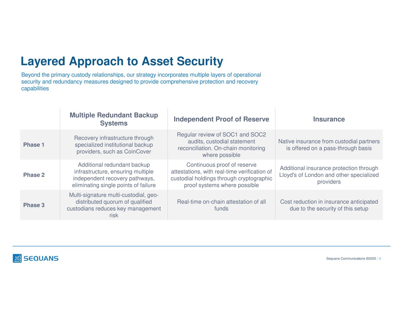 资产安全保险的分层方法独立的准备金证明多个冗余备份系统来自托管合作伙伴的原生保险是在传递的基础上提供的,定期审查SOC1和SOC2审计、托管报表对账。可能时的链上监测通过专门的机构备份提供商进行的恢复基础设施,例如通过伦敦劳合社和其他专业提供商进行的CoinCover Phase 1额外保险保护持续的准备金证明证明,在可能时通过加密证明系统实时验证保管持有量额外的冗余备份基础设施,确保多个独立的恢复路径,消除单点故障Phase 2由于这种设置的安全性而预期的保险成本降低所有资金的实时链上证明多签名多托管、地理分布的合格托管人法定人数减少关键管理风险Phase 3超越主要托管关系,我们的策略包含多层运营安全和冗余措施,旨在提供全面的保护和恢复能力Sequans通信©2025 | 9