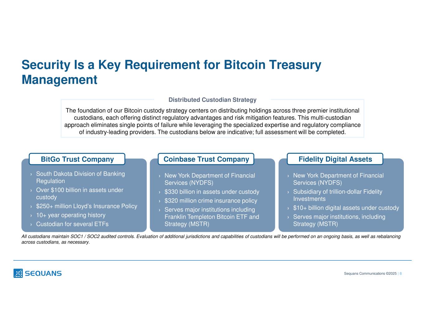 安全性是比特币金库管理的一项关键要求↓南达科他州银行监管部门丨托管资产超1000亿美元丨2.5亿+百万美元劳合社保险单丨10年以上运营历史丨多个ETF的托管人BitGo信托公司丨纽约金融服务部(NYDFS)丨托管资产3300亿美元丨3.2亿美元犯罪保险单丨为包括富兰克林邓普顿比特币ETF在内的主要机构提供服务和Strategy(MSTR)Coinbase信托公司丨纽约金融服务部(NYDFS)↓万亿美元富达投资的子公司丨托管的100 +亿美元数字资产↓为主要机构提供服务,包括Strategy(MSTR)富达数字资产的所有托管人都保持SOC1/SOC2经审计的控制。将持续对额外的管辖范围和托管人的能力进行评估,并视需要在托管人之间进行再平衡。我们的比特币托管战略的基础是将持有量分配给三个主要的机构托管人,每个机构都提供独特的监管优势和风险缓解功能。这种多托管人方法消除了单点故障,同时利用了行业领先提供商的专业知识和监管合规性。以下托管人为指示性;将完成全面评估。分布式托管人策略Sequans通信©2025 | 8