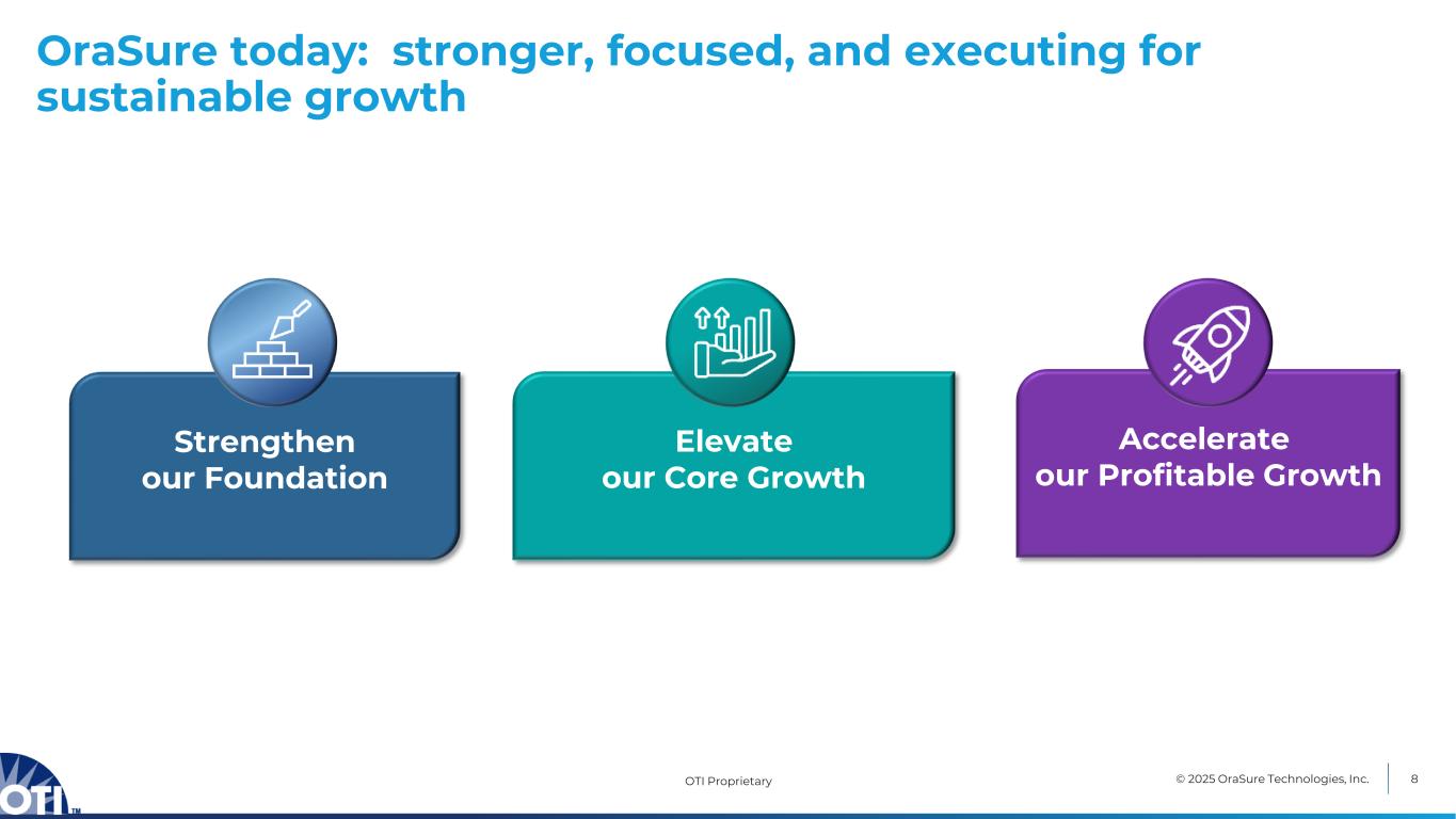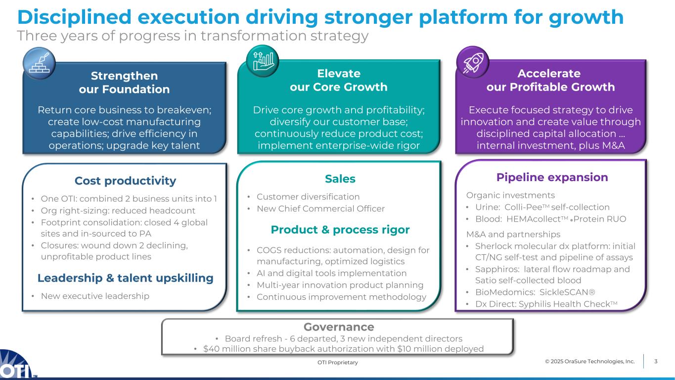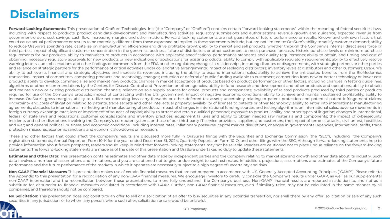 ©2025 OraSure Technologies,Inc. 2OTI专有免责声明前瞻性陈述:OraSure Technologies,Inc.(“公司”或“OraSure”)的本演示文稿包含联邦证券法含义内的某些“前瞻性陈述”,包括有关产品、候选产品开发和制造活动、监管提交和授权、收入增长和指导、来自政府订单的预期收入、成本节约、现金流、利润率增加和其他事项。前瞻性陈述并非对未来业绩或结果的保证。可能导致实际业绩或结果与这些声明中明示或暗示的存在重大差异的已知和未知因素包括但不限于:OraSure满足客户需求的能力;降低OraSure的支出率、利用制造效率并推动盈利增长的能力;营销和销售产品的能力,无论是通过公司内部、直接销售人员还是第三方;基因组学业务客户集中度较高的影响;分销商或其他客户未能达到采购预测,我们产品的历史采购水平或最低采购要求;按照适用规格、性能标准和质量要求制造产品的能力;获得新产品或现有产品的新适应症或应用的必要监管批准的能力、以及获得必要监管批准的时间和成本;遵守适用监管要求的能力;有效解决警告信、审计意见以及FDA或其他监管机构的其他调查结果或评论的能力;关系的变化,包括争议或分歧,与战略合作伙伴或其他方以及依赖战略合作伙伴执行合作安排下的关键活动;更换分销商的影响;分销商和其他客户的库存水平;OraSure实现其财务和战略目标并增加其收入的能力,包括扩大国际销售的能力;实现BioMedomics交易预期收益的能力;竞争对手、竞争产品和技术变化的影响;减少或推迟向客户提供的公共资金;来自新的或更好的技术或成本更低的产品的竞争;开发能力,新产品的商业化和市场推广;基于产品性能或其他因素的产品市场接受度变化,包括测试指南的变化,疾病控制和预防中心或其他机构的算法或其他建议;资助研发和其他产品及运营的能力;获得和维护新的或现有产品分销渠道的能力;依赖关键产品和组件的唯一供应来源;第三方生产的相关产品或使用公司产品所需的产品的可用性;与美国政府签订合同的影响;负面经济状况的影响;实现的能力并保持持续盈利能力;提高OraSure毛利率的能力;利用净经营亏损结转或其他递延税项资产的能力;与专利保护和潜在专利侵权索赔相关的不确定性;与专利相关的诉讼的不确定性和成本,商业秘密和其他知识产权;专利或其他技术许可的可用性;订立国际制造协议的能力;产品国际营销和制造的障碍;国际资金来源和测试算法的变化对国际销售的影响;外币汇率的不利变动;资本来源的损失或减值;吸引和留住合格人员的能力;面临产品责任和其他类型诉讼的风险;国际、联邦或州法律法规;客户整合和库存做法;设备故障和获得所需原材料和组件的能力;涉及公司计算机系统或我们的第三方IT服务提供商、供应商和客户的计算机系统的网络安全事件和其他中断的影响;恐怖袭击、内乱、敌对行动和战争的影响;以及一般政治、商业和经济状况,包括利率、通胀压力、资本市场混乱、政府机构变化、国际关税、贸易保护措施、经济制裁和经济放缓或衰退。这些和其他可能影响公司业绩的因素在OraSure提交给美国证券交易委员会(“SEC”)的文件中得到了更充分的讨论, 包括公司的注册声明、截至2024年12月31日止年度的10-K表格年度报告、10-Q表格季度报告以及向SEC提交的其他文件。尽管前瞻性陈述有助于提供有关未来前景的信息,但读者应记住,前瞻性陈述可能并不可靠。告诫读者不要过分依赖这些前瞻性陈述。前瞻性陈述是在本演示文稿发布之日作出的,OraSure不承担更新这些陈述的义务。估计和其他数据:本演示文稿包含独立方和公司就市场规模和增长做出的估计和其他数据以及有关其行业的其他数据。此类数据涉及许多假设和限制,请注意不要对此类估计给予不应有的权重。此外,对公司未来业绩的预测、假设和估计以及经营所在市场的未来业绩必然存在高度的不确定性和风险。非GAAP财务指标本演示文稿使用了某些未根据美国公认会计原则(“GAAP”)编制的财务指标。有关任何非GAAP财务指标的对账,请参阅本演示文稿的附录。我们鼓励投资者仔细考虑公司在GAAP下的业绩,以及我们补充的非GAAP信息和这些演示之间的对账,以更全面地了解公司的业务。非GAAP财务业绩是在根据GAAP计算的财务指标之外报告的,而不是作为替代或优于根据GAAP计算的财务指标。此外,非GAAP财务指标,即使标题相似,也可能不是所有公司都以相同的方式计算,因此不应进行比较。不招揽:本演示不构成任何潜在交易中的出售要约或购买证券的要约招揽,也不得通过任何要约、招揽或在任何司法管辖区出售任何此类证券,或向任何人出售此类要约、招揽或出售将是非法的。