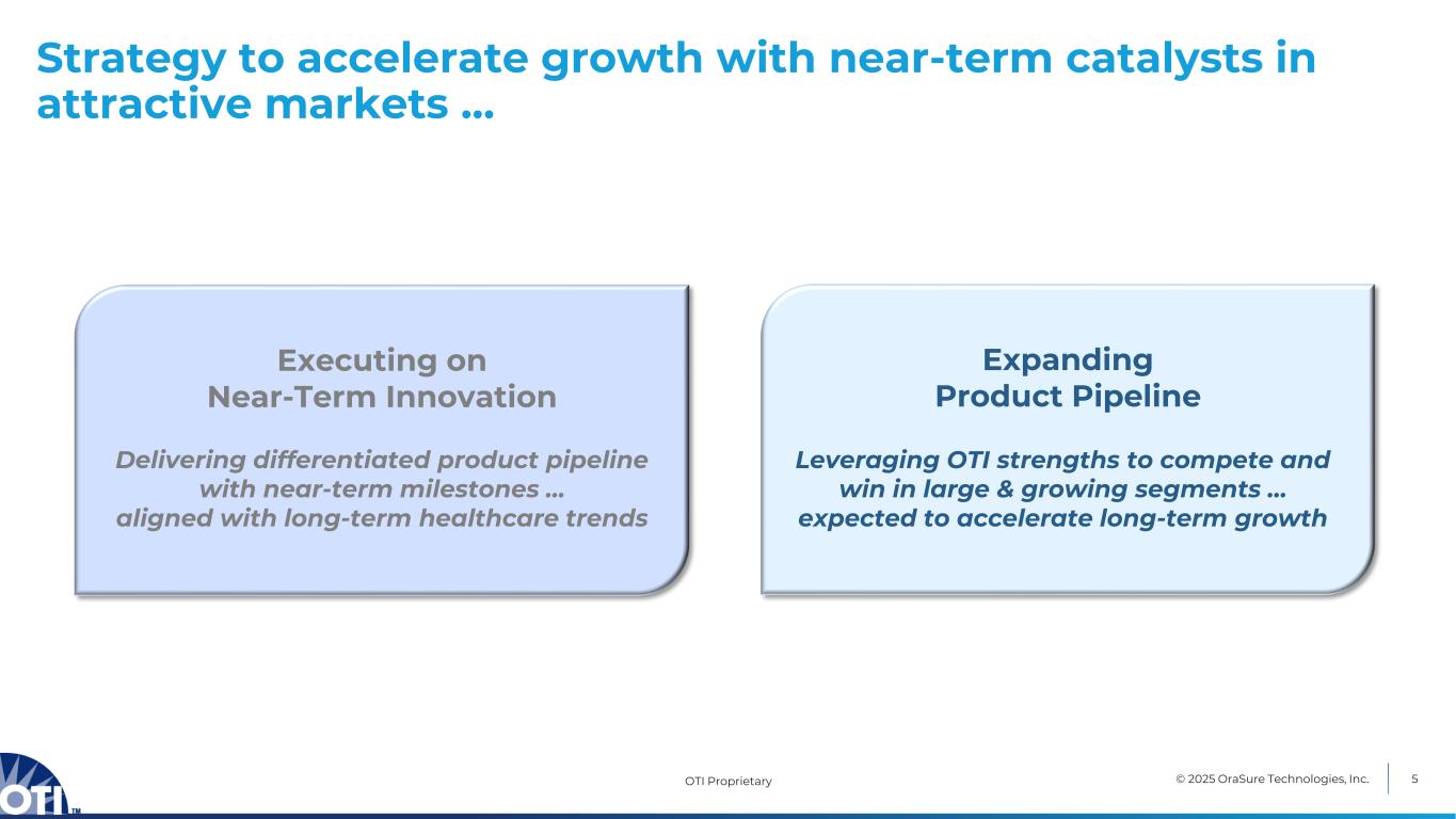 ©2025 OraSure Technologies,Inc. 4OTI Proprietary Financial Performance Summary创新并以严格的执行和问责制运营Q3 results •总收入:2710万美元•核心收入:2700万美元• Non-GAAP毛利率:44.2%外部环境:OTI正在使其客户群多样化,同时积极与客户合作,以应对美国公共卫生项目、传染病检测、和研究增长:定位于2026年及以后的核心业务增长↓潜在产品里程碑的管道有望加速增长利润率:调整后毛利率达到50%的路径↓随着销量增长,利润率有显着扩张的机会资产负债表:截至2025年第三季度,有2.16亿美元现金,没有债务第四季度指引•总收入:25至2800万美元•非美国通用会计准则毛利率:低40%区间