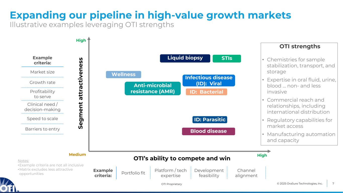 ©2025 OraSure Technologies,Inc. 6OTI专有产品路线图:预期的近期里程碑描述蛋白质特异性血液采集和样本稳定在家中首次-void尿液自采集一次性分子dx,快速测试血液自采;Dot =干血斑vs.毛细血管抽血全球市场$ 700m $ 500m $ 1.5b $ 92B(传统采集)里程碑/状态RUO启动完成2025年7月向FDA提交多个STI的临床研究正在进行中2025年末/2026年初向FDA提交CT/NG初始分析的临床研究正在进行中Dot初始应用的监管审查未来通过分销协议启动注:基于公司预测、建模和外部研究的市场规模。