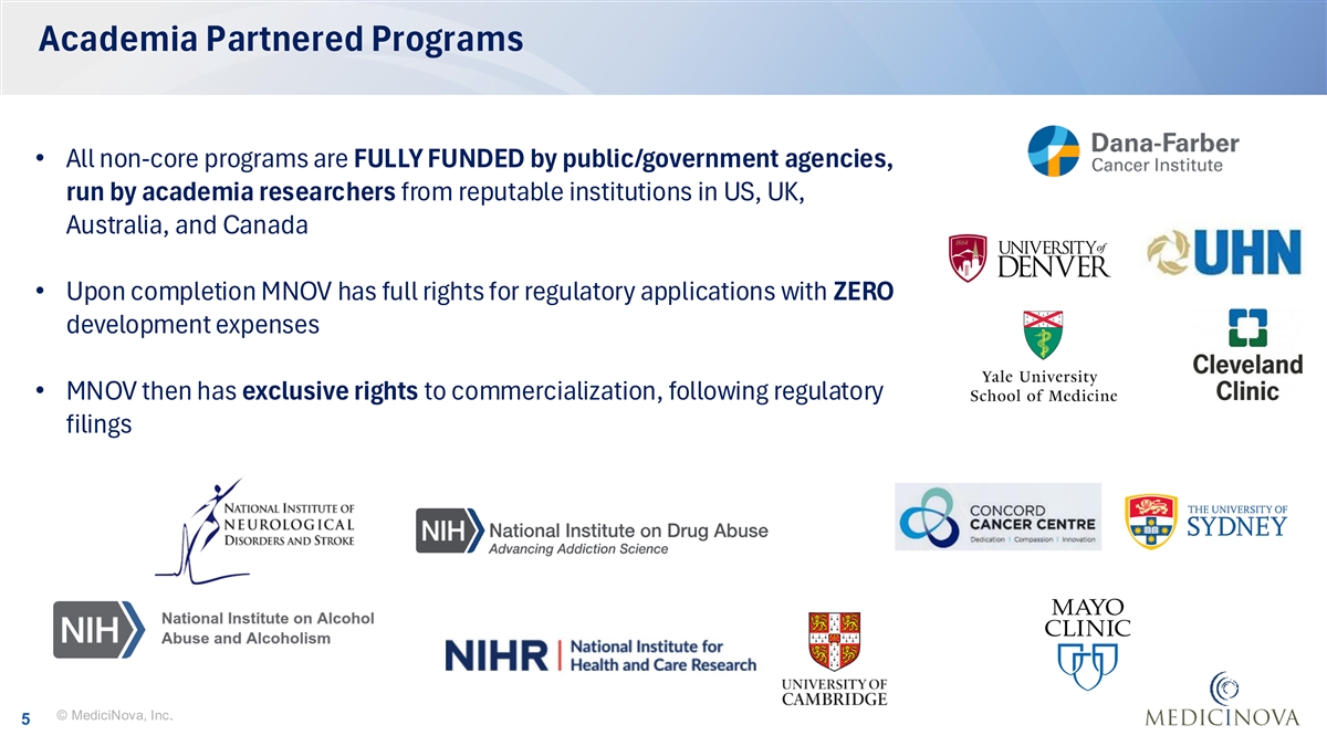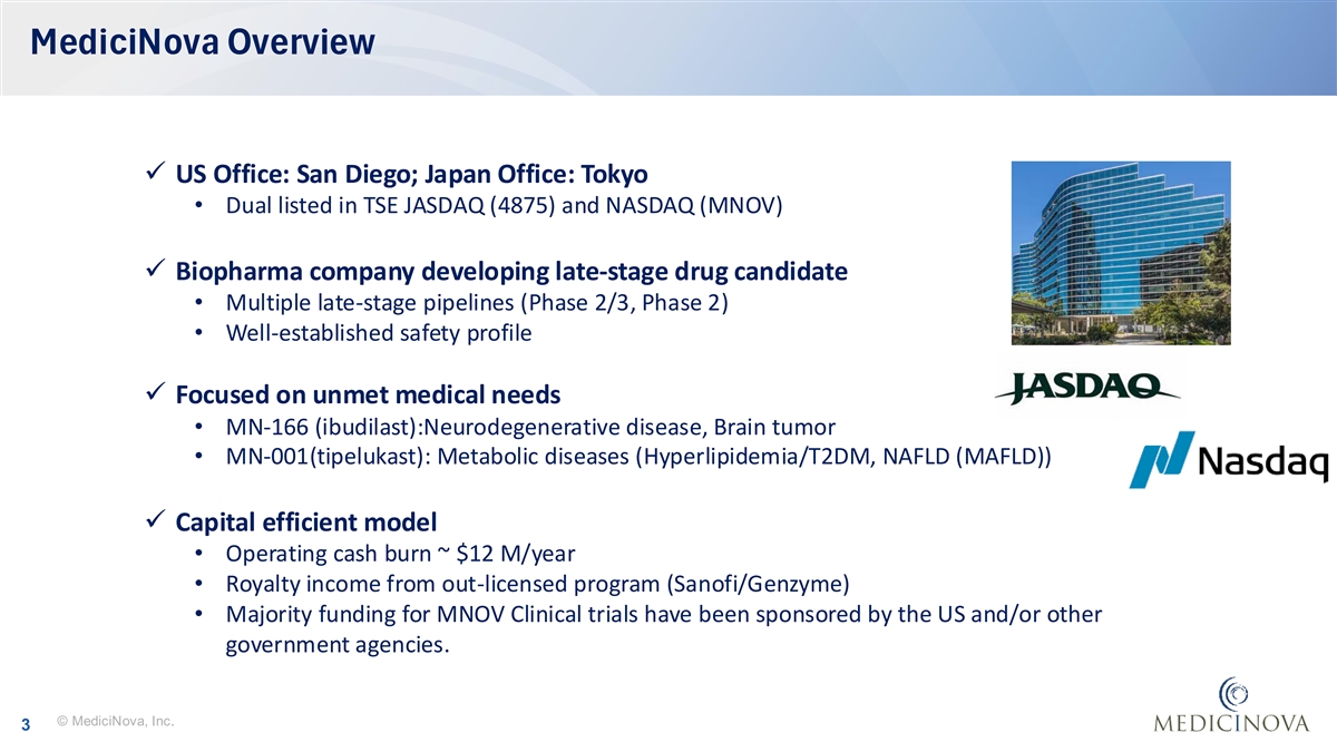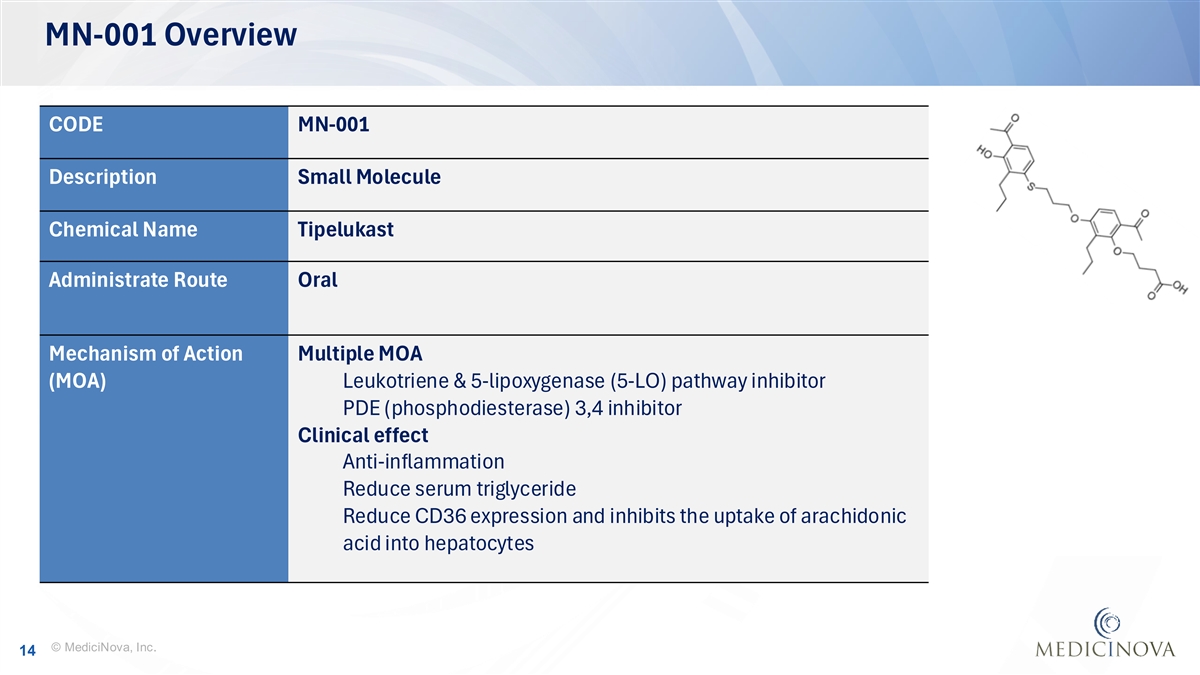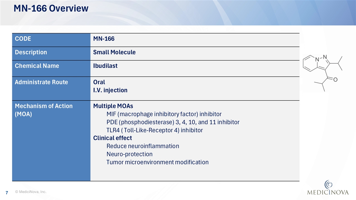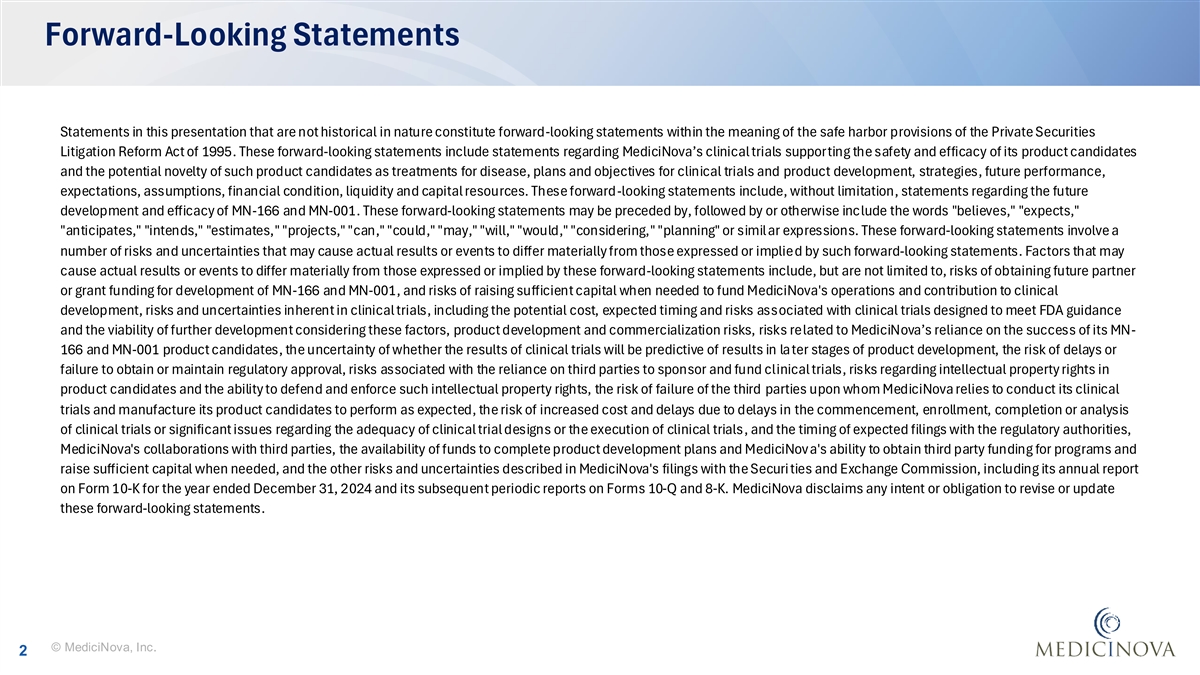 前瞻性陈述本演示文稿中非历史性的陈述构成1995年《私人证券诉讼改革法案》安全港条款含义内的前瞻性陈述。这些前瞻性陈述包括关于美第奇新星生物技术的临床试验支持其候选产品的安全性和有效性以及此类候选产品的潜在新颖性的陈述,例如疾病治疗、临床试验的计划和目标以及产品开发、战略、未来业绩、预期、假设、财务状况、流动性和资本资源。这些前瞻性陈述包括但不限于关于MN-166和MN-001未来发展和功效的陈述。这些前瞻性陈述可能在前面、后面或以其他方式包含“相信”、“预期”、“预期”、“打算”、“估计”、“项目”、“可以”、“可以”、“可能”、“将”、“将”、“将”、“考虑”、“计划”或类似的表达方式。这些前瞻性陈述涉及许多风险和不确定性,可能导致实际结果或事件与此类前瞻性陈述明示或暗示的结果或事件存在重大差异。可能导致实际结果或事件与这些前瞻性陈述中明示或暗示的结果或事件存在重大差异的因素包括但不限于为MN-166和MN-001的开发获得未来合作伙伴或授予资金的风险,以及在需要时筹集足够资金为美第奇新星生物技术的运营和对临床开发的贡献提供资金的风险、临床试验中固有的风险和不确定性,包括与旨在满足FDA指导的临床试验相关的潜在成本、预期时间和风险,以及考虑到这些因素、产品开发和商业化风险的进一步开发的可行性,与美第奇新星生物技术依赖其MN-166和MN-001候选产品成功相关的风险、临床试验结果是否能够预测产品开发最终阶段结果的不确定性、延迟或未能获得或维持监管批准的风险、与依赖第三方赞助和资助临床试验相关的风险、与产品候选者的知识产权相关的风险以及捍卫和执行此类知识产权的能力,美第奇新星生物技术所依赖的进行临床试验和制造候选产品的第三方未能按预期表现的风险,由于临床试验的开始、注册、完成或分析的延迟或有关临床试验设计的充分性或临床试验的执行的重大问题而导致的成本增加和延迟的风险,以及预计向监管机构备案的时间安排,美第奇新星生物技术与第三方的合作,可用于完成产品开发计划的资金以及MediciNov a在需要时为项目获得第三方资金并筹集足够资金的能力,以及美第奇新星生物技术向Securi关系和交易委员会提交的文件中描述的其他风险和不确定性,包括其截至2024年12月31日止年度的10-K表格年度报告及其随后的10-Q和8-K表格定期报告。美第奇新星生物技术不承担任何修改或更新这些前瞻性陈述的意图或义务。©MediciNova, Inc. 2
