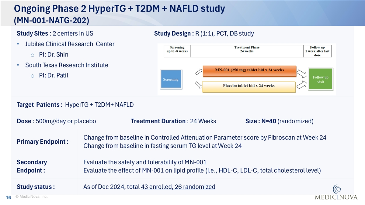 正在进行的2期HyperTG + T2DM + NAFLD研究(MN-001-NATG-202)研究地点:美国2个研究设计中心:R(1:1)、PCT、DB研究• Jubilee临床研究中心o PI:Dr. Shin • South Texas Research Institute o PI:Dr. Patil目标患者:HyperTG + T2DM + NAFLD剂量:500mg/天或安慰剂治疗持续时间:24周大小:N = 40(随机)第24周Fibroscan对照衰减参数评分较基线的变化主要终点:第24周空腹血清TG水平较基线的变化二级评估MN-001终点的安全性和耐受性:评估MN-001对血脂谱(即HDL-C、LDL-C、总胆固醇水平)的影响研究现状:截至2024年12月,共43例入组,26例随机©MediciNova, Inc. 16