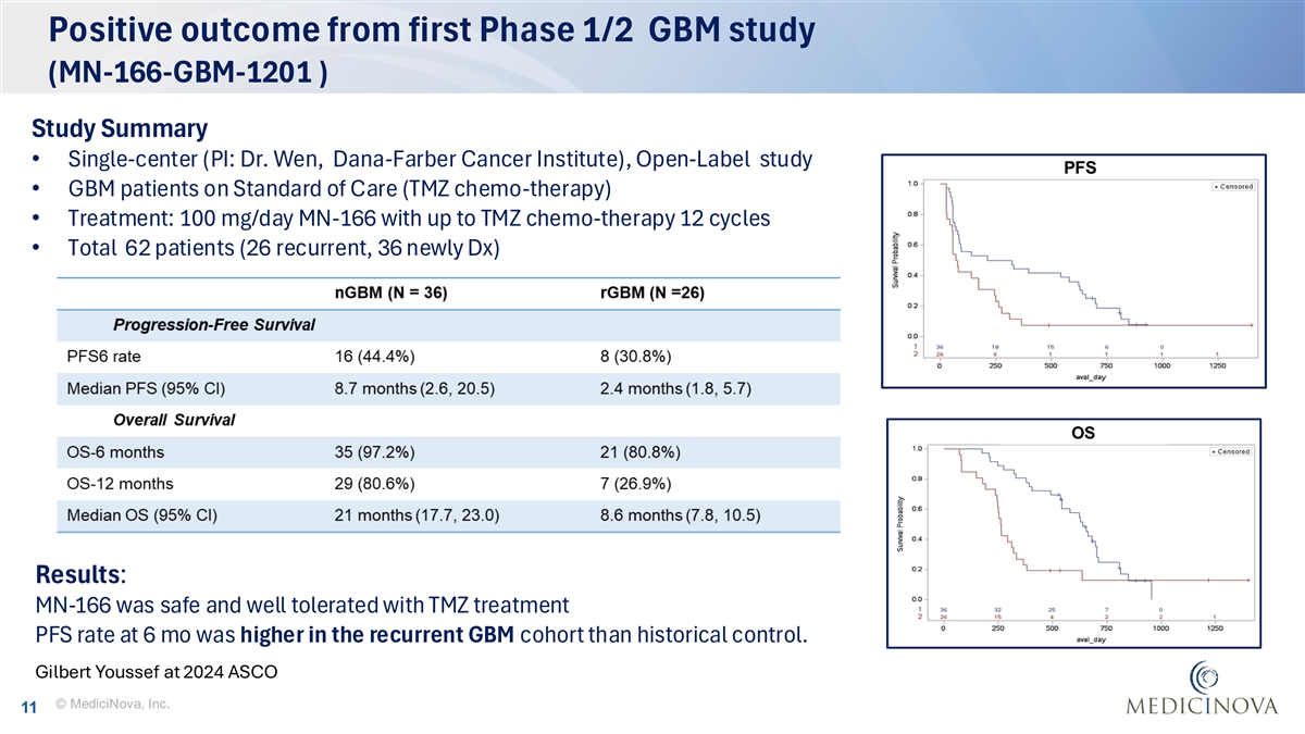 首个1/2期GBM研究(MN-166-GBM-1201)的阳性结果研究摘要•单中心(PI:Dr. Wen,Dana-Farber Cancer Institute),开放标签研究• GBM患者接受标准护理(TMZ化疗)•治疗:100mg/天MN-166与高达TMZ化疗12个周期•共有62名患者(26名复发,36名新DX)结果:MN-166在复发的GBM队列中使用TMZ治疗6个月时安全性和耐受性良好的PFS率高于历史对照。吉尔伯特·优素福在2024年ASCO©MediciNova, Inc. 11