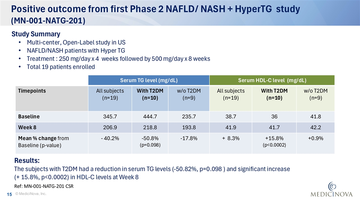 MN-001概述CODEMN-001描述小分子化学名称Tipelukast给药路线口服作用机制多MOA(MOA)白三烯& 5-脂氧合酶(5-LO)通路抑制剂PDE(磷酸二酯酶)3,4抑制剂临床效果抗炎降低血清甘油三酯降低CD36表达,抑制花生四烯酸摄取进入肝细胞©MediciNova, Inc. 14