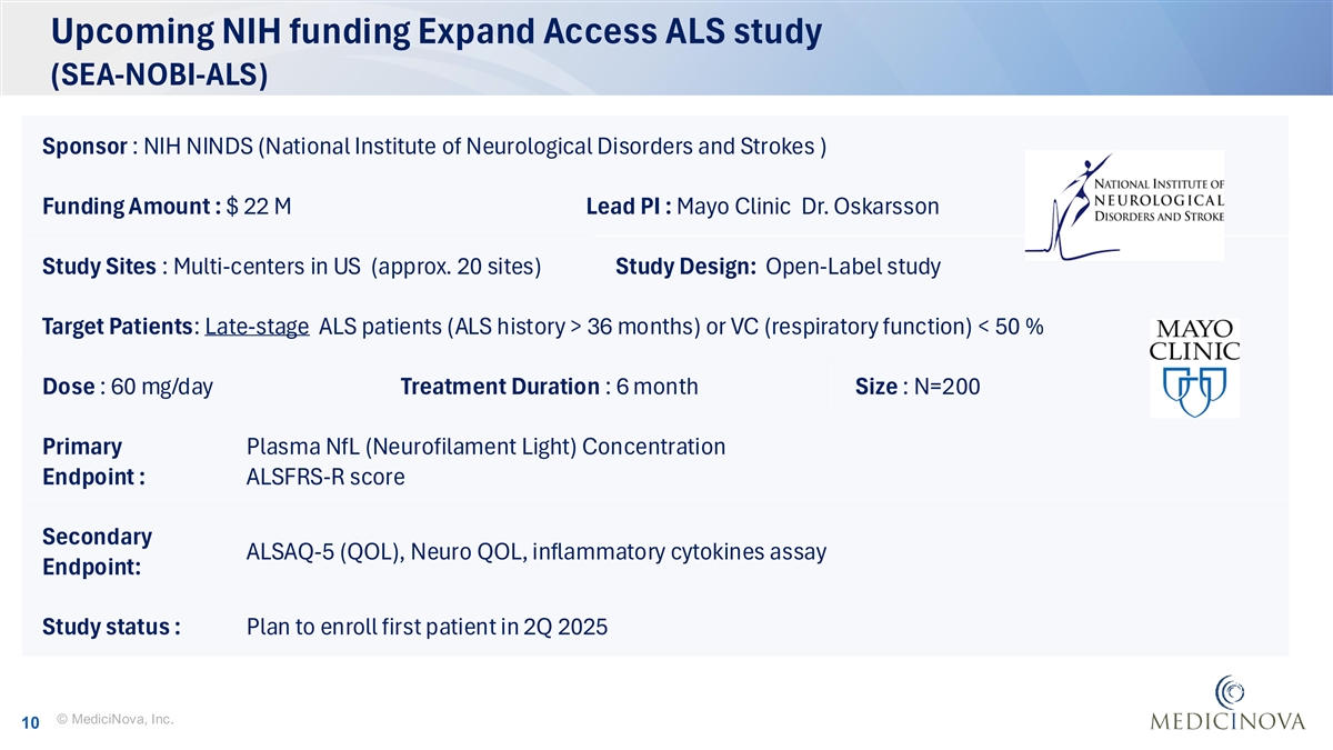 即将进行的NIH资助扩大准入ALS研究(SEA-NOBI-ALS)赞助商:NIHNINDS(美国国家神经系统疾病和脑卒中研究所)资助金额:2200万美元牵头PI:Mayo Clinic Oskarsson博士研究地点:美国多中心(约20个地点)研究设计:开放标签研究目标患者:晚期ALS患者(ALS病史> 36个月)或VC(呼吸功能)< 50%剂量:60毫克/天治疗持续时间:6个月大小:N = 200原发性血浆NFL(神经丝光)浓度终点:ALSFRS-R评分次级ALSAQ-5(QOL),神经QOL,炎性细胞因子测定终点:研究状态:计划于2025年第二季度入组首例患者©MediciNova, Inc. 10