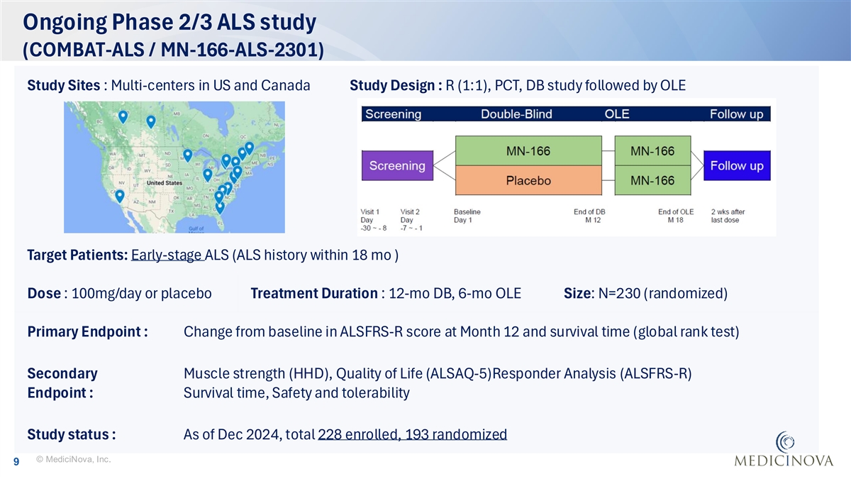 正在进行的2/3期ALS研究(COMBAT-ALS/MN-166-ALS-2301)研究地点:美国和加拿大的多中心研究设计:R(1:1)、PCT、DB研究,然后是OLE目标患者:早期ALS(18个月内有ALS病史)剂量:100mg/天或安慰剂治疗持续时间:12个月DB,6个月OLE大小:N = 230(随机)主要终点:12个月时ALSFRS-R评分与基线的变化和生存时间(全球等级测试)二级肌肉力量(HHD)、生活质量(ALSAQ-5)应答者分析(ALSFRS-R)终点:生存时间、安全性和耐受性研究状态:截至2024年12月,共228人入组,193个随机©MediciNova, Inc. 9