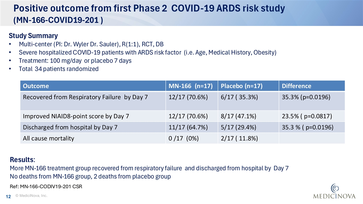 首个2期新冠肺炎ARDS风险研究(MN-166-COVID 19-201)的阳性结果研究摘要•多中心(PI:Dr. Wyler Dr. Sauler)、R(1:1)、RCT、DB •具有ARDS风险因素(即年龄、病史、肥胖)•治疗:100mg/天或安慰剂7天•共有34名患者随机结果MN-166(n = 17)安慰剂(n = 17)到第7天呼吸衰竭恢复的差异12/17(70.6%)6/17(35.3%)35.3%(p = 0.0 196)到第7天改善NIAID8分12/17(70.6%)8/17(47.1%)23.5%(p = 0.08 17)到第7天出院11/17(64.7%)5/17(29.4%)35.3%(p = 0.0 196)全因死亡率0/17(0%)2/17(11.8%)结果:更多MN-166治疗组呼吸衰竭康复出院到第7天MN-166组无死亡,安慰剂组死亡2例Ref:MN-166-CODIV19-201 CSR©MediciNova, Inc. 12