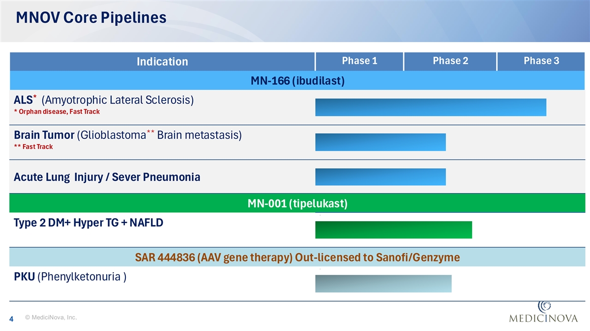 美第奇新星生物技术概览丨美国办事处:圣地亚哥;日本办事处:东京•在TSE JASDAQ(4875)和NASDAQ(MNOV)双重上市丨生物制药公司开发后期候选药物•多个后期管道(2/3期、2期)•完善的安全概况丨专注于未满足的医疗需求• MN-166(ibudilast):神经退行性疾病、脑肿瘤• MN-001(tipelukast):代谢性疾病(高脂血症/T2DM、NAFLD(MAFLD))丨资本高效模式•运营现金消耗~1200万美元/年•外包项目的特许权使用费收入(丨赛诺菲赛诺菲/健赞)• MNOV的大部分资金©MediciNova, Inc. 3