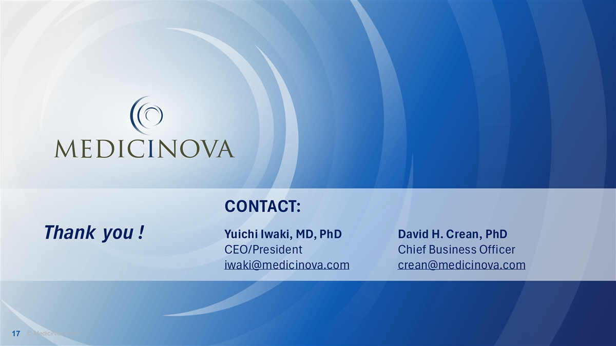 联系人:Yuichi Iwaki,医学博士,David H. Crean,博士谢谢!首席执行官/总裁首席商务官iwaki@medicinova.com crean@medicinova.com©MediciNova, Inc. 17
