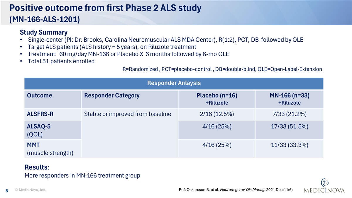 首个2期ALS研究(MN-166-ALS-1201)的阳性结果研究摘要•单中心(PI:Dr. Brooks,Carolina Neuromuscular ALS MDA中心),R(1:2),PCT,DB后OLE •目标ALS患者(ALS病史~5年),接受利鲁唑治疗•治疗:60毫克/天MN-166或安慰剂X6个月后6个月OLE •共51名患者入组R =随机,PCT =安慰剂对照,DB =双盲,OLE = open-Label-Extension Responder Anlaysis Outcome Responder Category Placebo(n = 16)MN-166(n = 33)+ Riluzole + Riluzole ALSFRS-R较基线稳定或改善2/16(12.5%)7/33(21.2%)ALSAQ-5 4/16(25%)17/33(51.5%)(QOL)MMT 4/16(25%)11/33(33.3%)(肌力)结果:MN-166治疗组更多的响应者©MediciNova, Inc. Ref:Oskarsson B,et al. Neurodegener Dis Manag。2021年12月;11(6)8