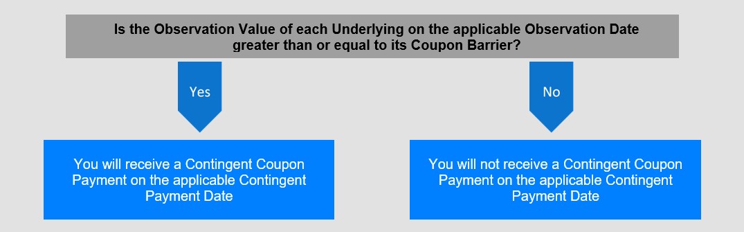 您可能不会收到任何或有息票付款。票据不提供任何定期固定息票支付。票据的投资者不一定会收到票据的任何或有息票付款。如果任何标的在某个观察日的观察值小于其票息障碍,您将不会收到适用于该观察日的或有票息支付。如果任何标的的观察值在票据期限内的所有观察日均低于其票息壁垒,则在票据期限内不会收到任何或有票息付款,也不会获得票据的正收益。