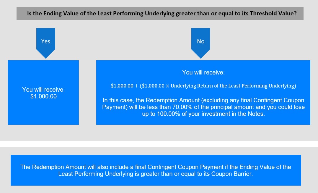 假设票据未在到期前赎回,如果任何标的较其起始值下跌超过30%,到期时您的投资将受到表现最差标的价值下跌的1:1下行敞口,最高100%的本金面临风险;否则,到期时,您将收到本金金额。到期时,如果收盘水平为每个最终观察日标的大于等于其起始值的70.00%。