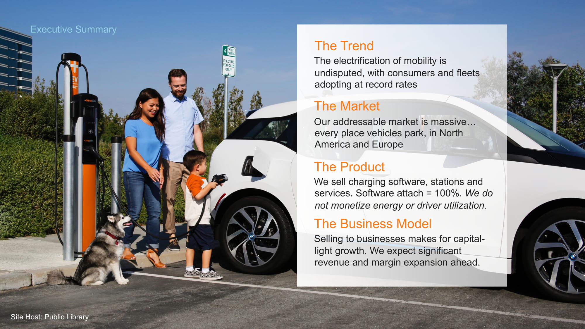 2020ChargePoint,Inc.移动电气化的趋势是无可争议的,消费者和车队以创纪录的速度采用市场我们的可寻址市场是巨大的…每个地方的停车场,在北美和欧洲的产品,我们销售的充电软件,车站和服务。附着率=100%。我们不会将能源或驱动程序的使用货币化。销售给企业的商业模式有利于资本的轻型化增长。我们预计未来将有可观的收入和利润率扩张。执行摘要7网站主办:公共图书馆