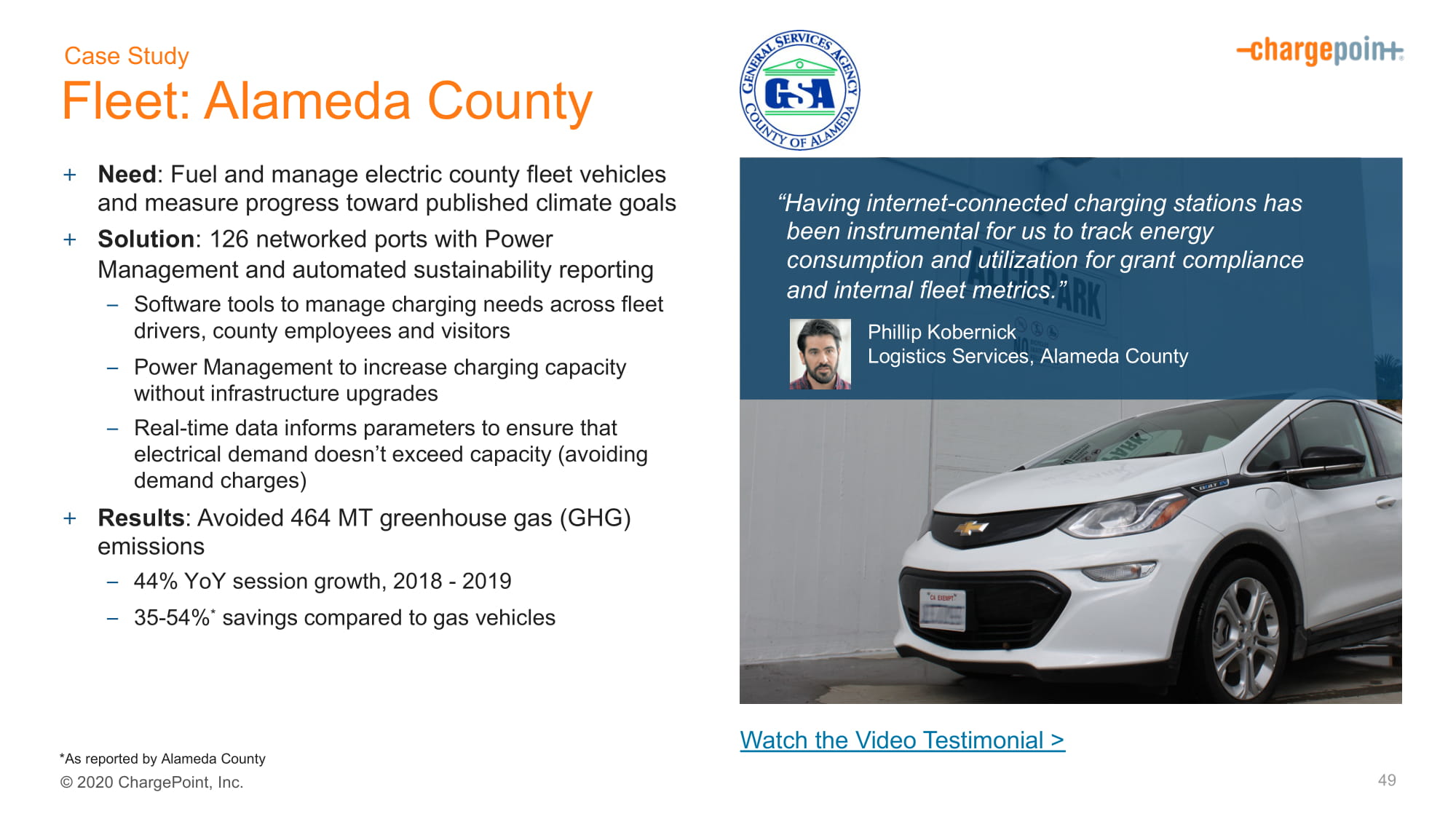 2020ChargePoint,Inc.+Need:Fuel and Management Electric County Fleet Vehicles and Measure Progress to Published Climate Goals+Solution:126Networked Ports with Power Management and Automated Sustainability Reporting-用于管理车队司机充电需求的软件工具,县员工和访客-在没有基础设施升级的情况下提高充电容量的电力管理-实时数据告知参数,以确保电力需求不超过容量(避免需求收费)+结果:避免了4.64亿吨温室气体(GHG)排放-44%的会话增长,2018-2019-35-54%*与燃气汽车相比节省49观看视频见证>“拥有互联网连接的充电站对我们跟踪能源消耗和利用以符合授权和内部车队指标至关重要”。Phillip Kobernick物流服务公司,阿拉米达县案例研究船队:阿拉米达县*阿拉米达县报告