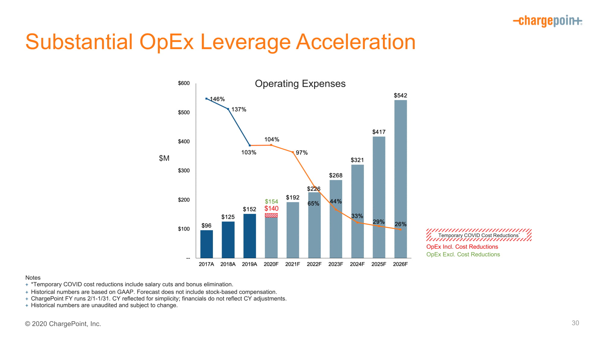2020ChargePoint,Inc.30大幅OPEX杠杆加速运营支出$140Notes+*临时COVID成本削减包括降薪和取消奖金。+历史数字基于GAAP。预测不包括基于股票的补偿。+chargepoint fy运行2/1-1/31。Cy反映为简单;财务数字不反映Cy调整。历史数据未经审计,可能会发生变化。包括opex。费用减少,不包括在内。成本削减临时COVID成本削减*$M