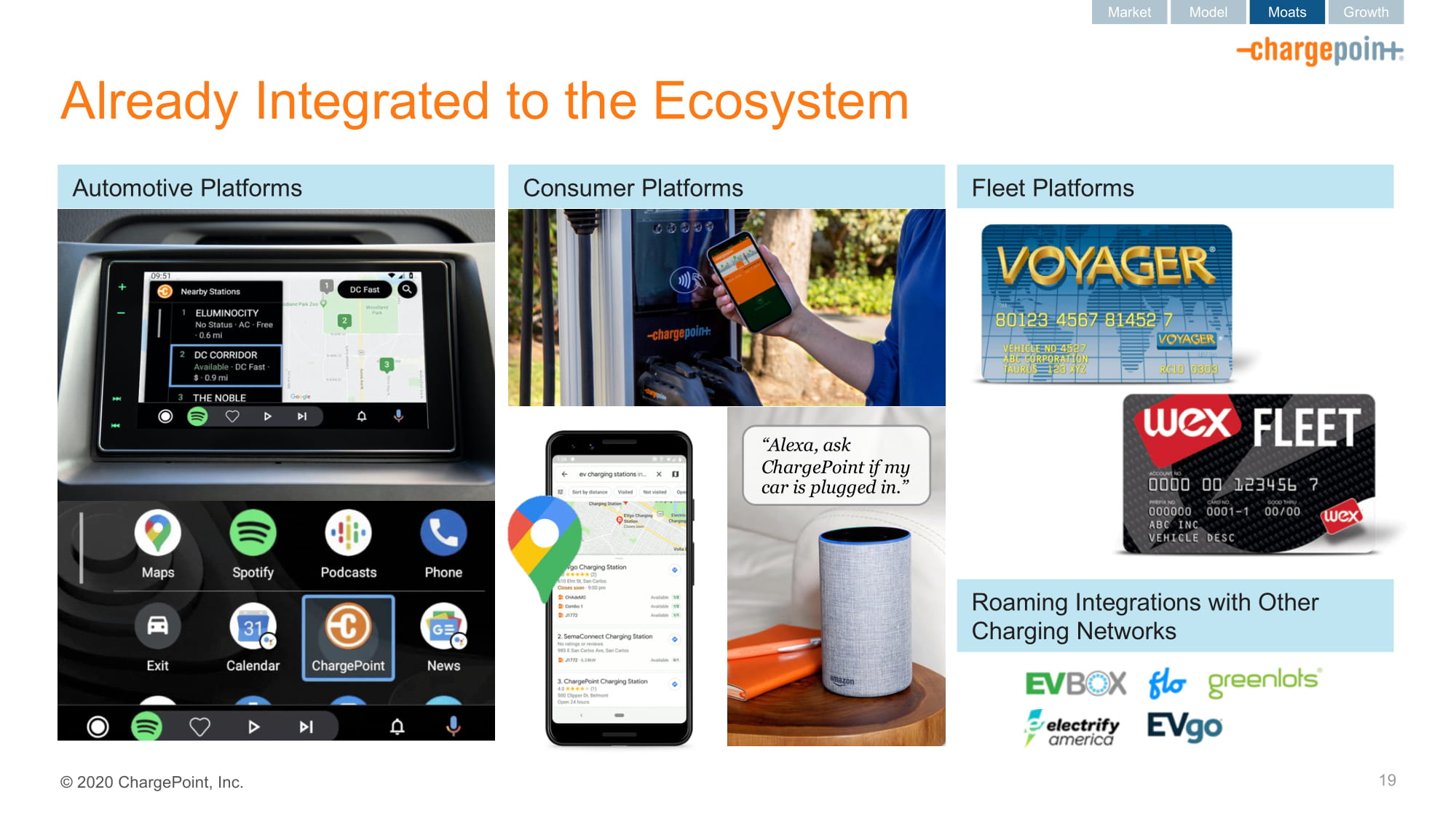 2020ChargePoint,Inc.已经整合到Ecosystem19市场模式护城河成长型汽车平台消费平台Fleet Platforms“Alexa,问问ChargePoint我的车是不是插电了”。漫游与其他充电网络的集成