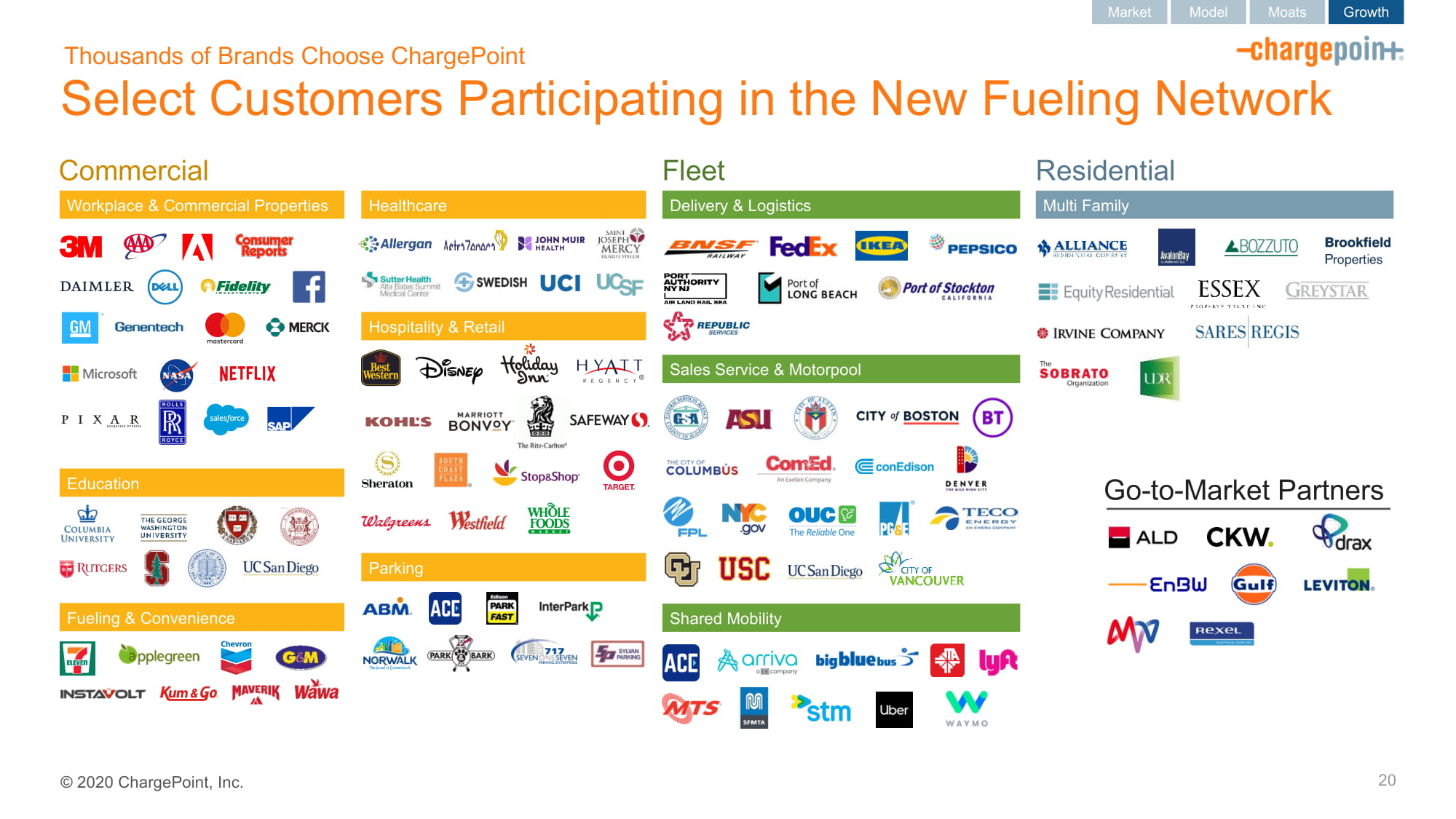 2020ChargePoint,Inc.选择参与新加油网络的客户20个工作场所和商业物业商业数以千计的品牌选择ChargePoint车队住宅教育加油和便利医疗酒店和零售停车场交付和物流多家庭销售服务和汽车池共享移动上市合作伙伴市场模式护城河增长